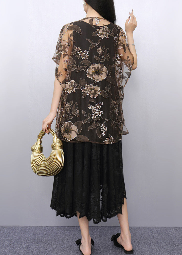 Loose Brown O-Neck Tulle Top And Maxi Dress Two Pieces Set Summer