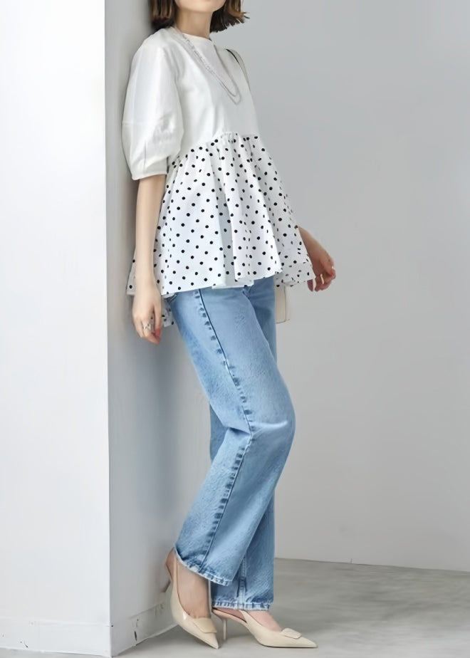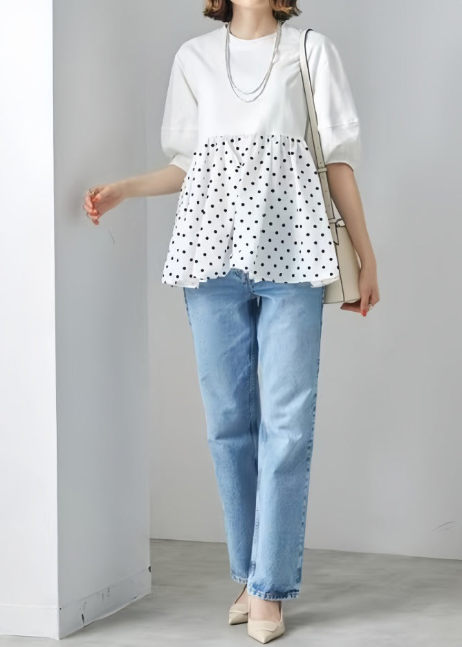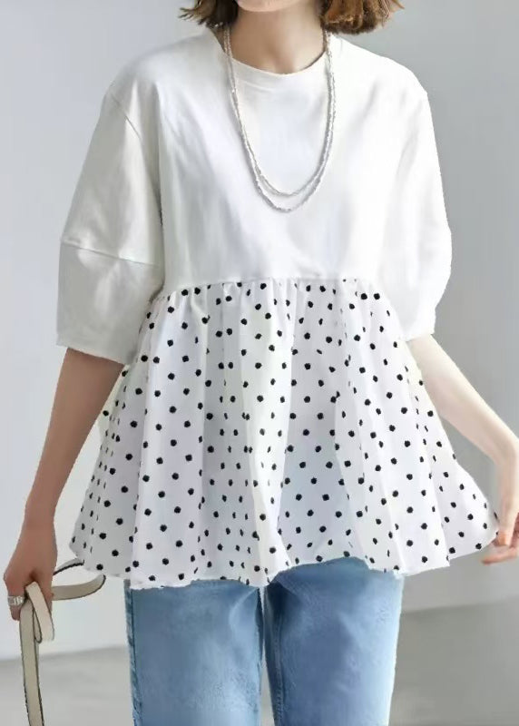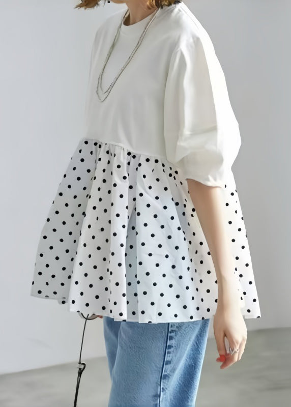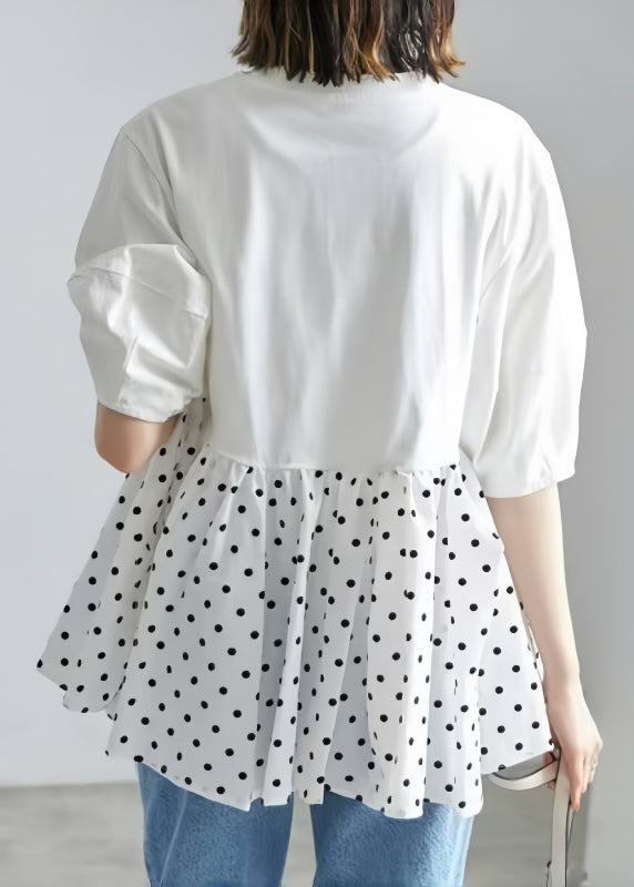 Modern White Patchwork Dot Cotton Blouses Half Sleeve