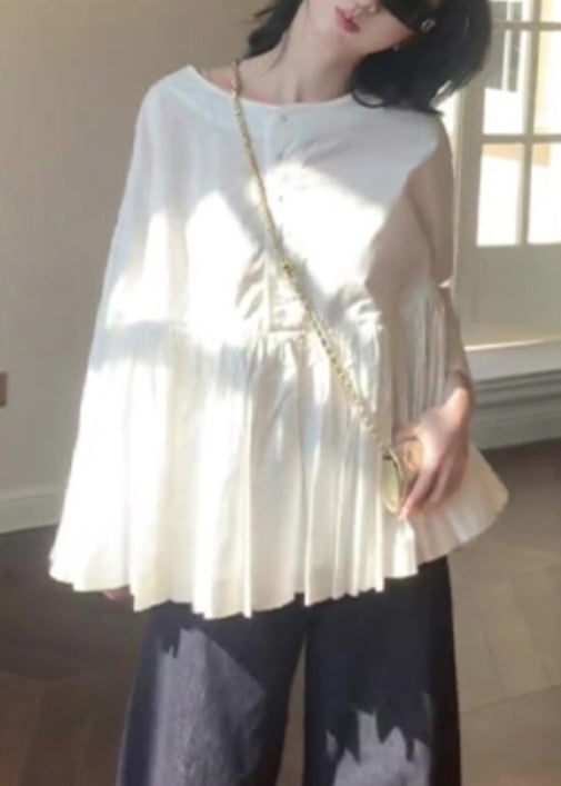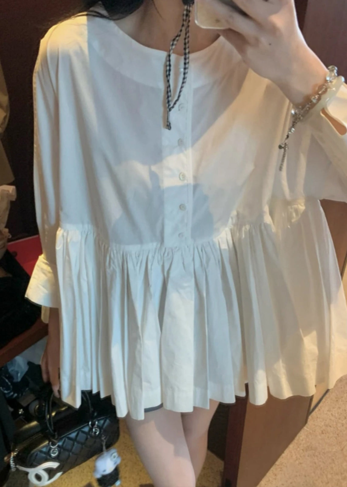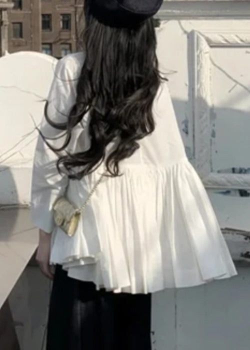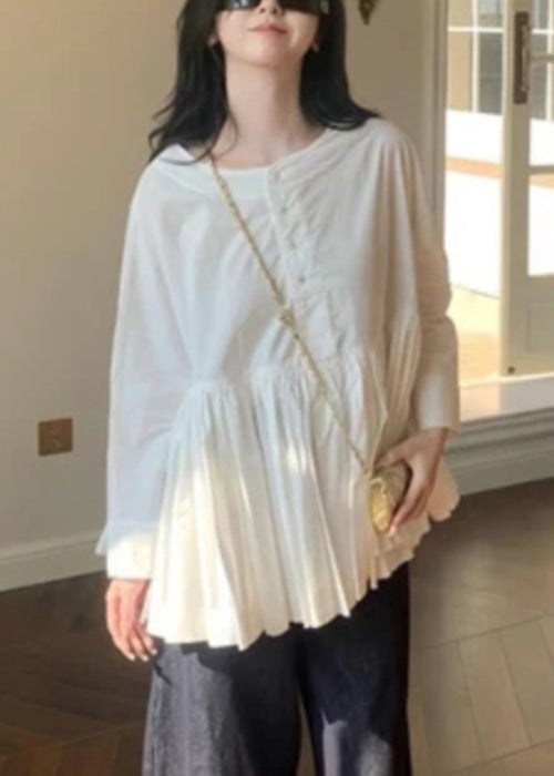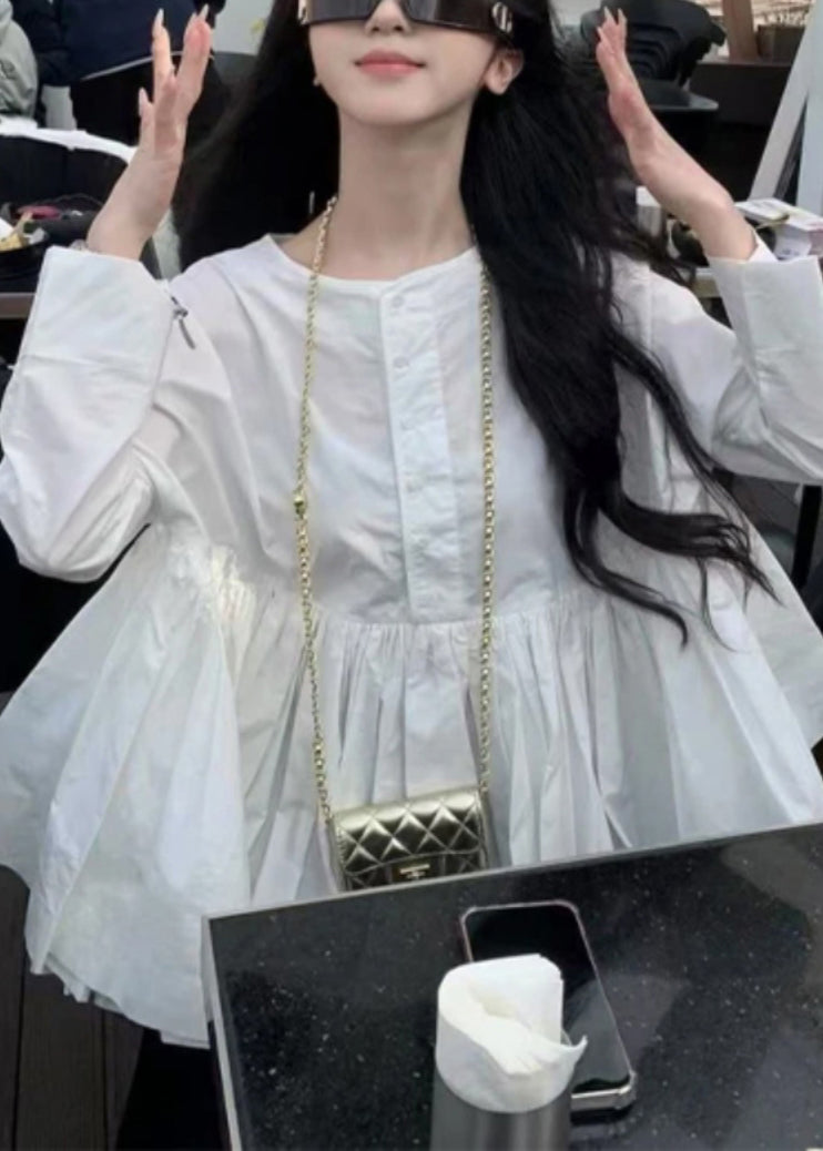 New White O Neck Button Wrinkled Cotton Shirt Fall