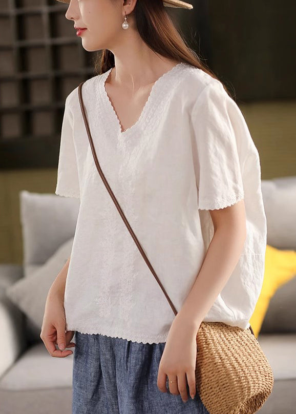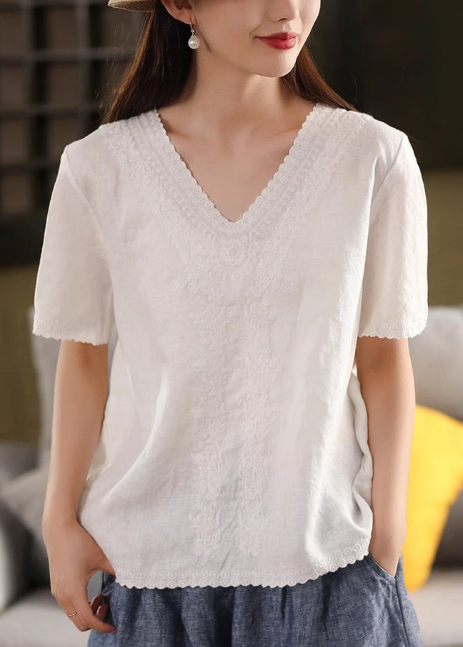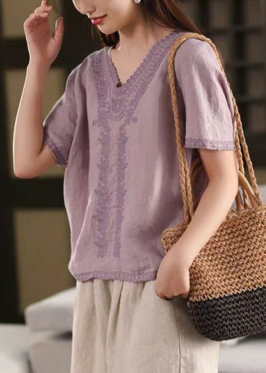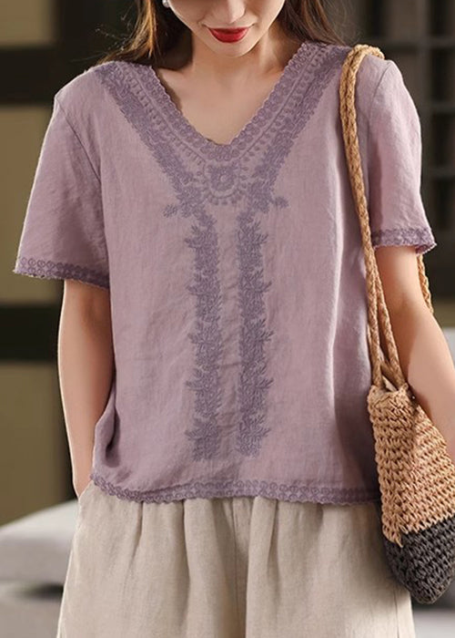 Purple Solid Loose Linen Summer T Shirts Embroidered