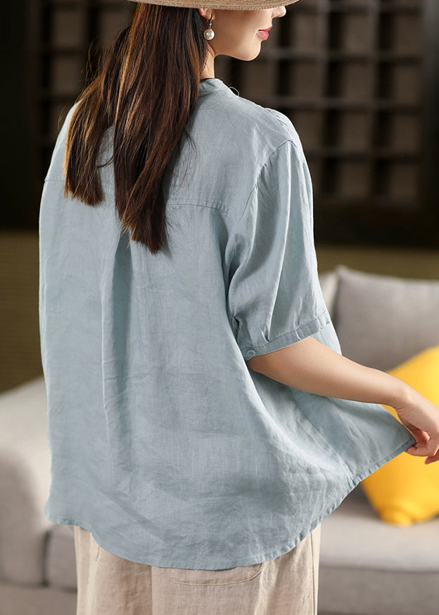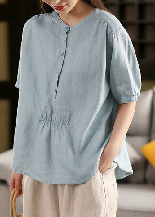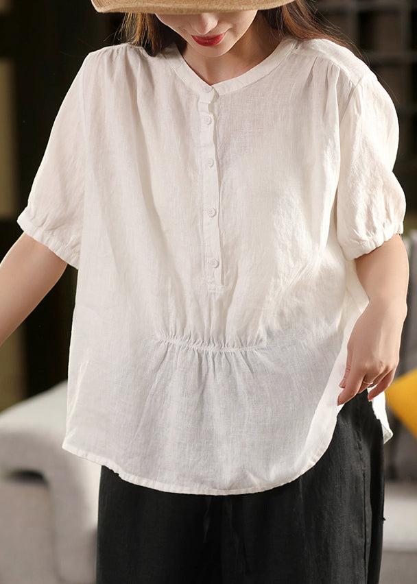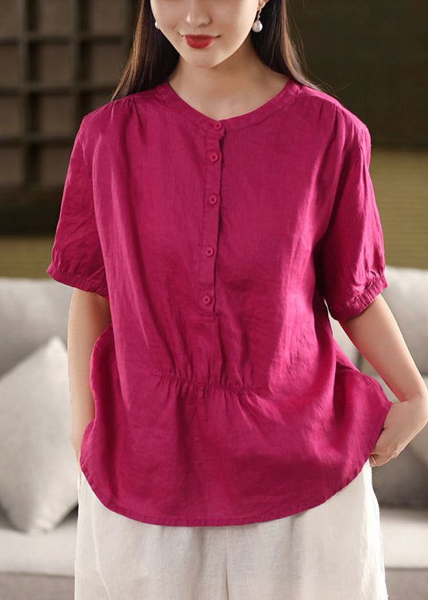 Rose Button Wrinkled Loose Linen Shirt O Neck