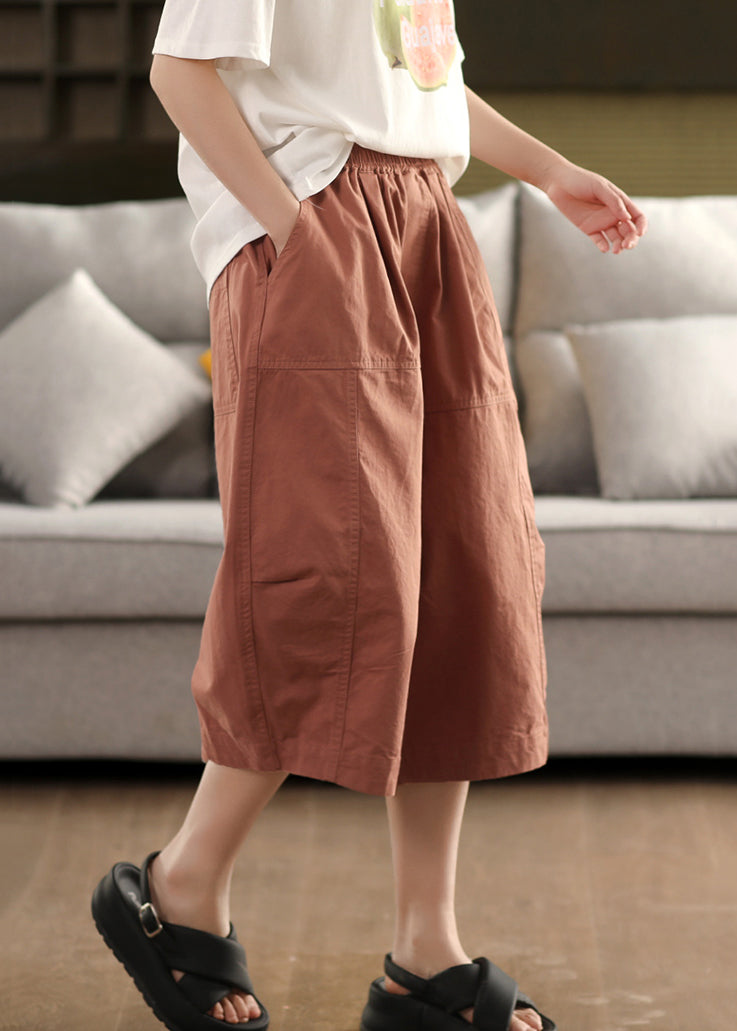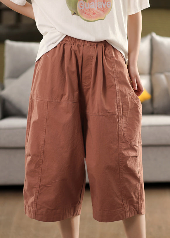 Simple Brick Red Pockets Elastic Waist Cotton Crop Pants Summer