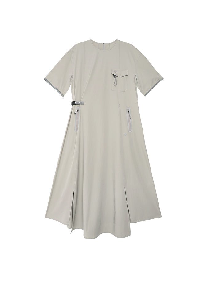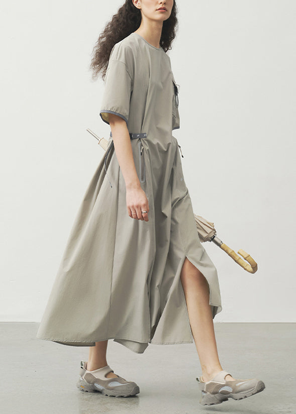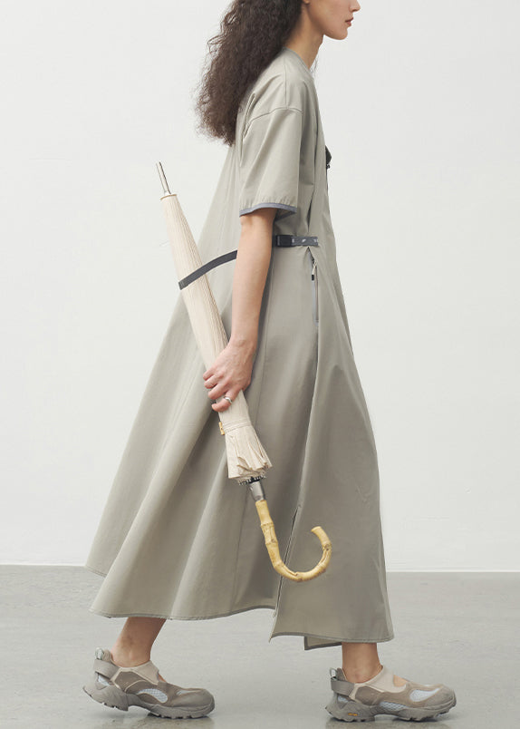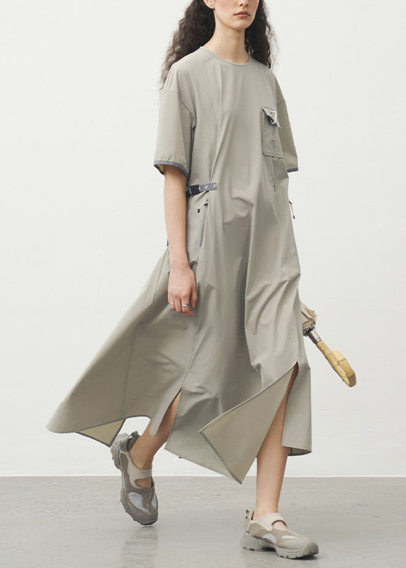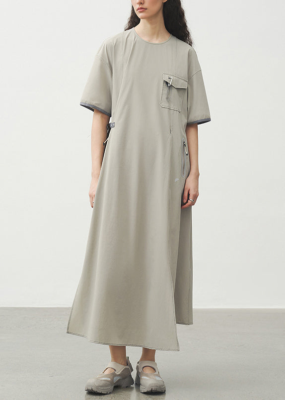 Simple Grey Khaki O Neck Pockets Patchwork Dress Summer