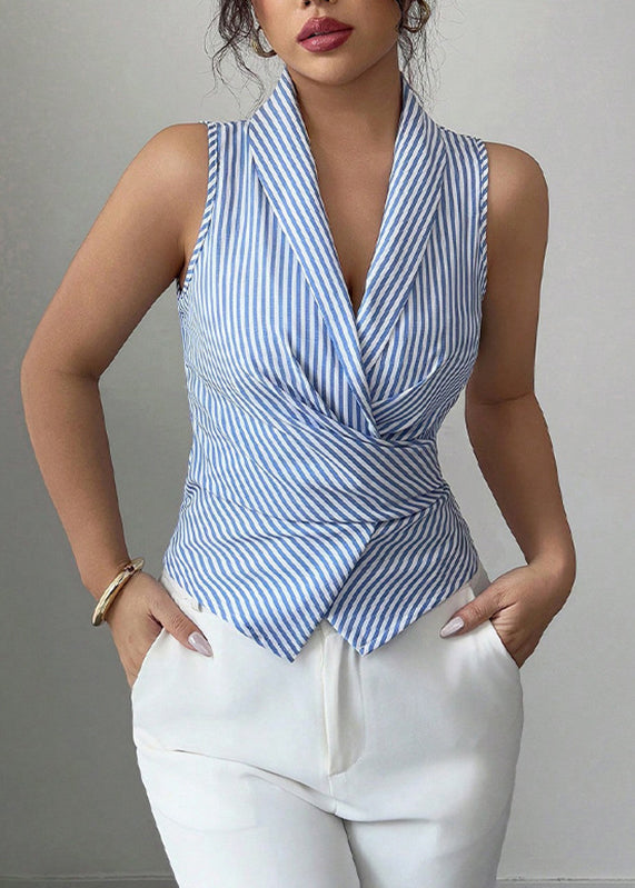 Slim Fit Blue Striped Notched Wrinkled Tops Sleeveless