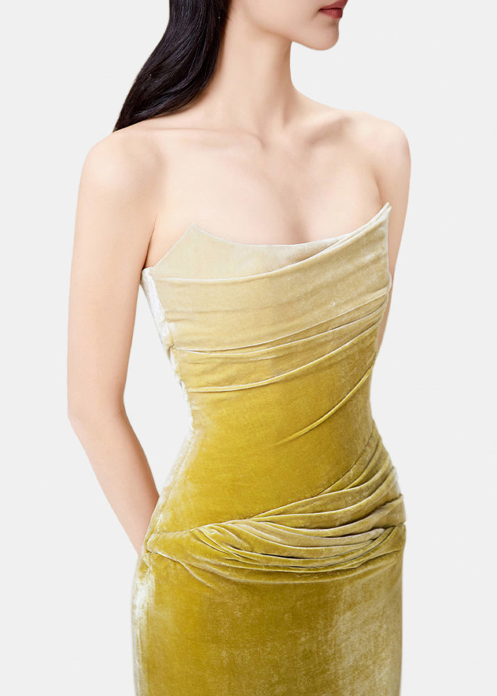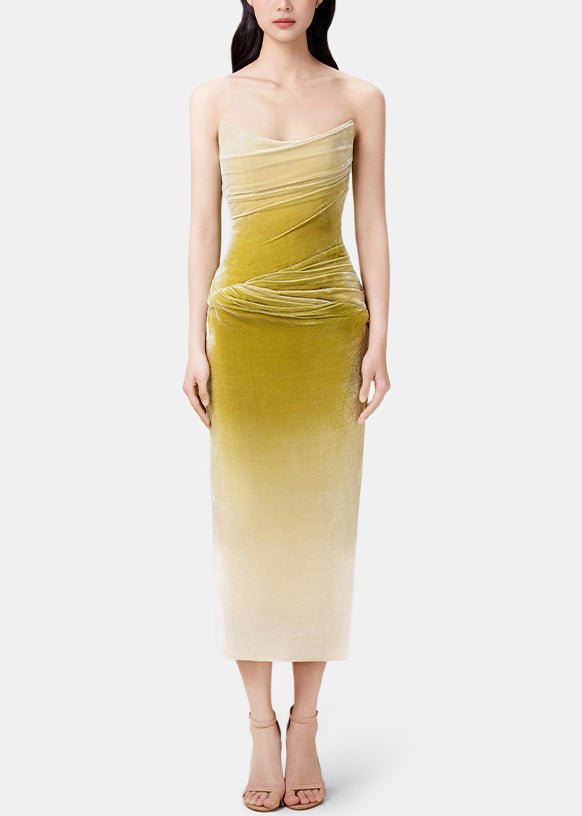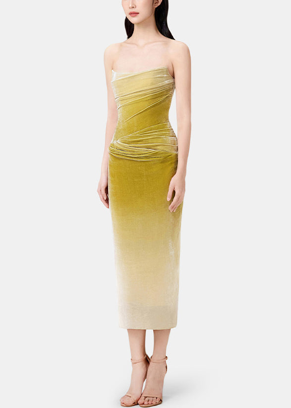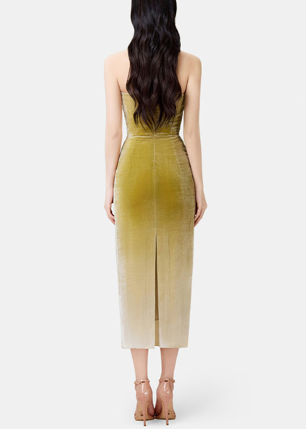 Slim Fit Gradient Color Wrinkled Side Open Silk Velvet Spaghetti Strap Dress Sleeveless
