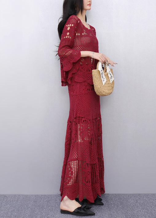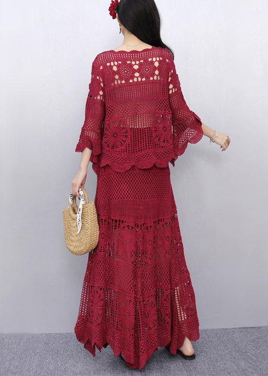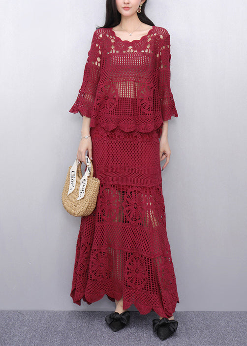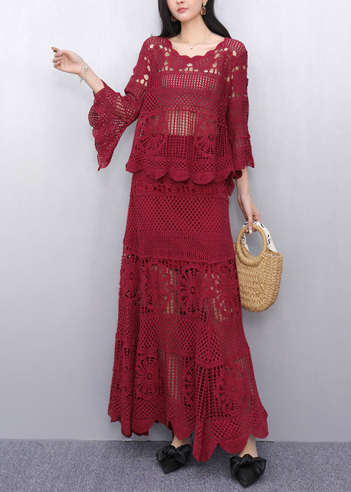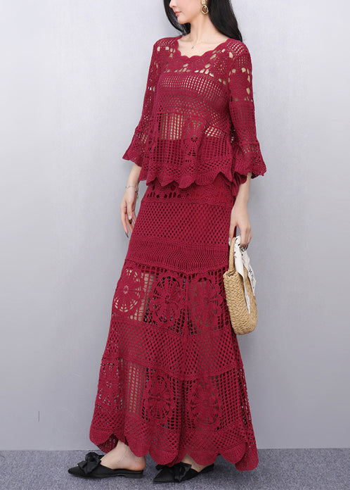 Style Red Hollow Out Knit Two Pieces Set Flare Sleeve