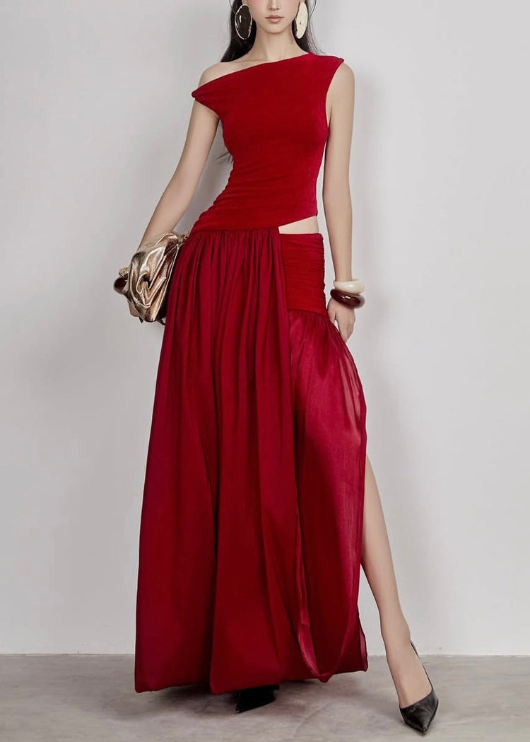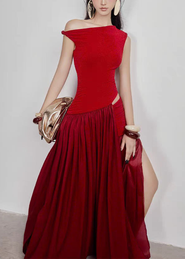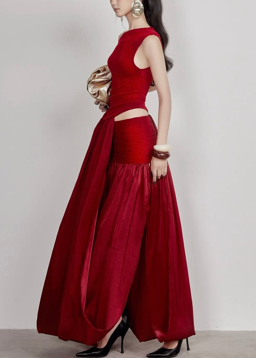 Stylish Red Wrinkled Hollow Out Cotton Long Dress Sleeveless