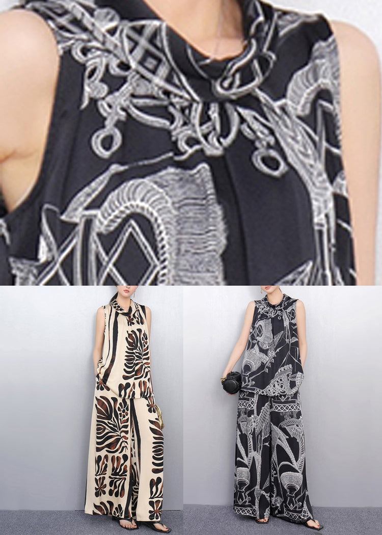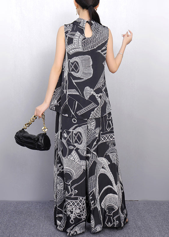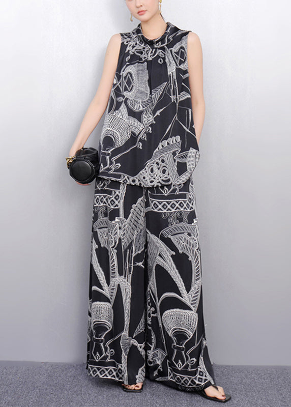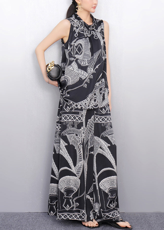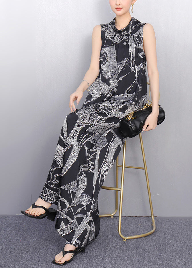 Vogue Black Print Top And Wide Leg Pants Two Pieces Set Summer