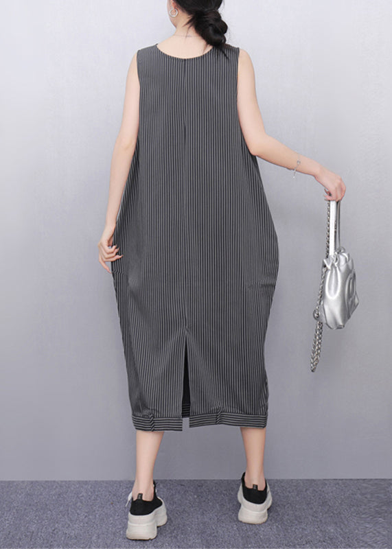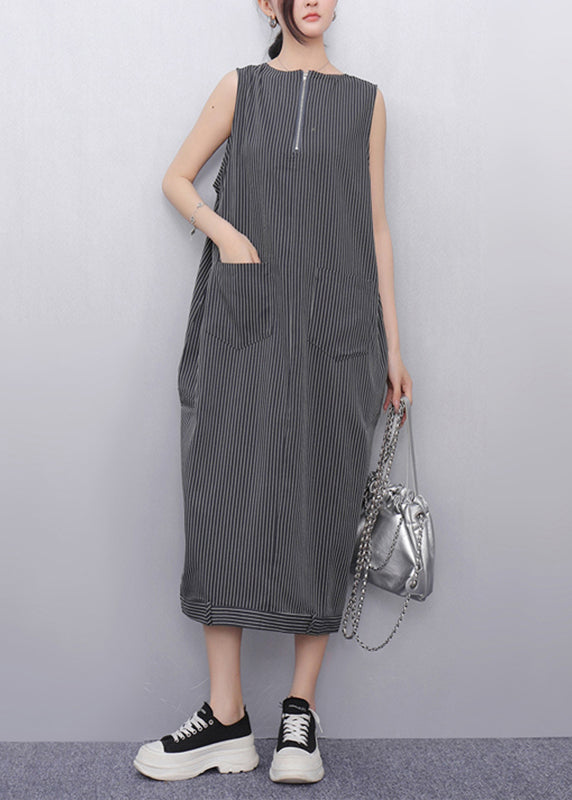 Women Dark Grey Striped Pockets Long Dresses Sleeveless