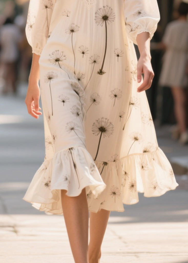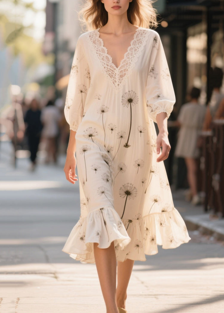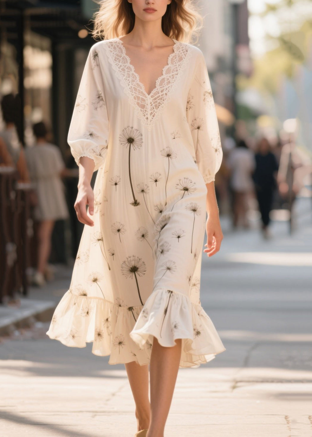 Women White Print Patchwork Chiffon Long Dress Bracelet Sleeve