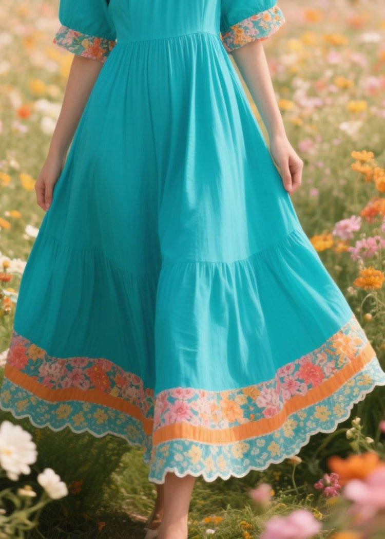 Loose Blue U Neck Patchwork Print Cotton Dress Summer