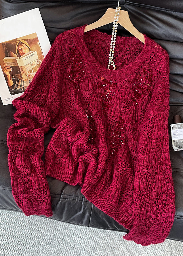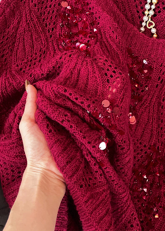 Art Purple O Neck Sequins Hollow Out Knit Sweater Tops Fall
