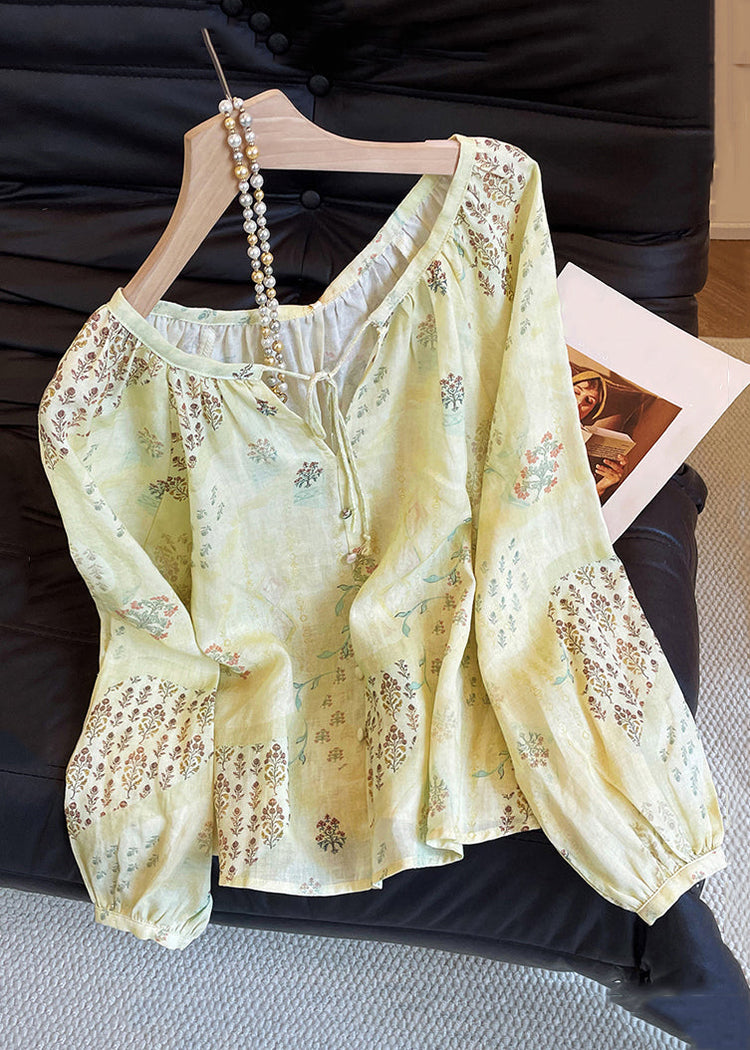 New Yellow V Neck Print Lace Up Cotton Blouse Tops Fall