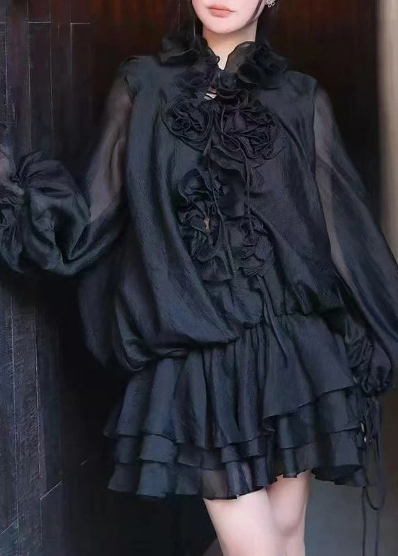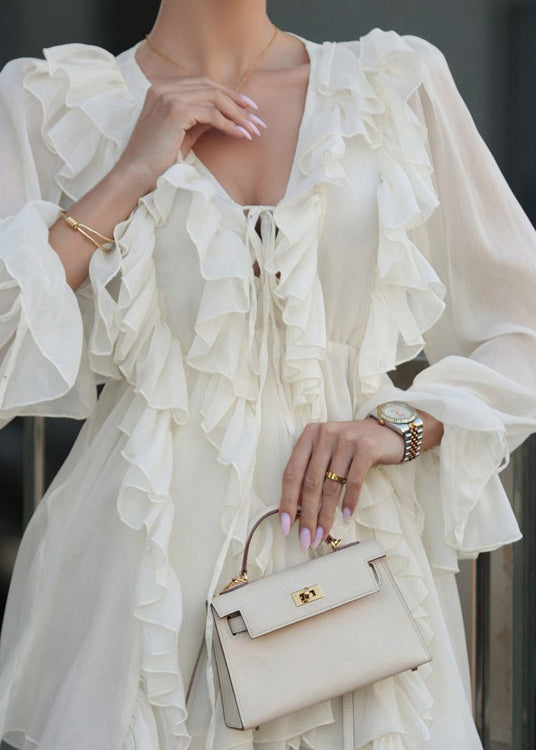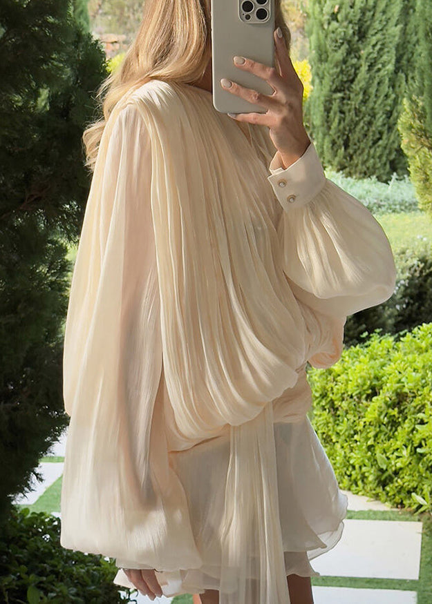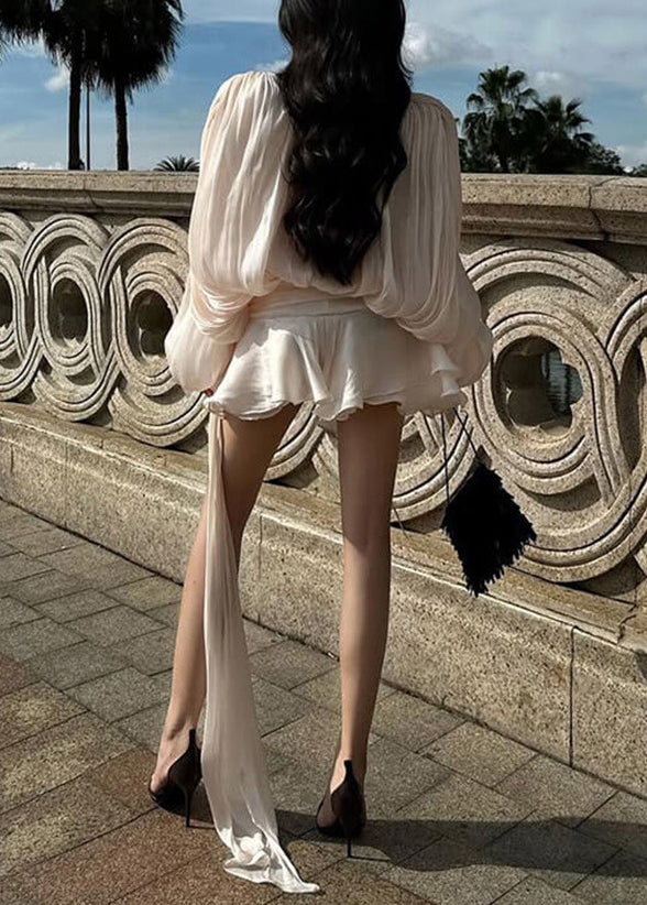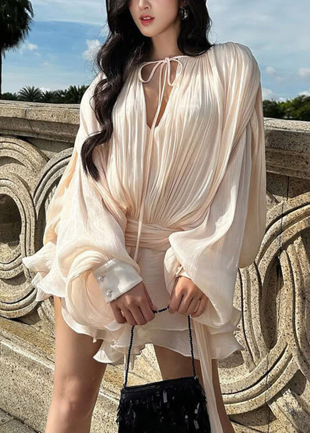 Art Beige Ruffled Lace Up Solid Chiffon Mini Dresses Spring