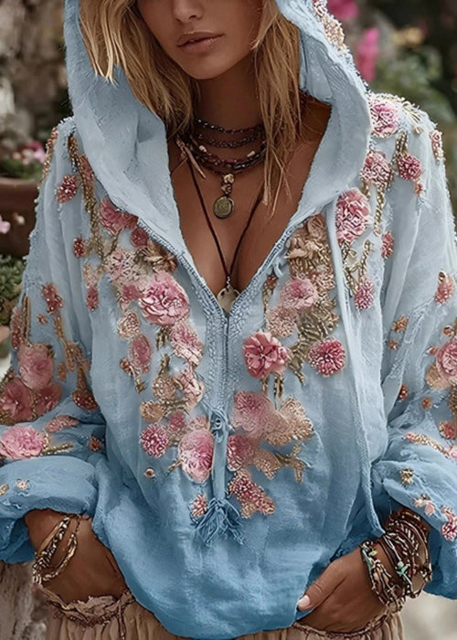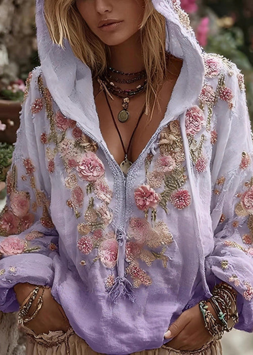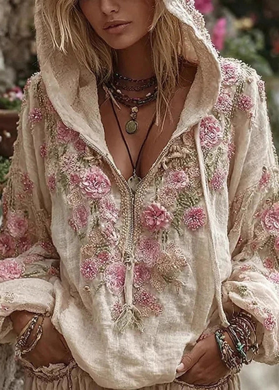 Bohemian Apricot Hooded Print Cotton Sweatshirt Spring