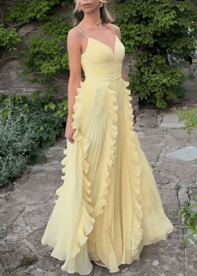 Classy Yellow V Neck Ruffled High Waist Chiffon Spaghetti Strap Dress Sleeveless