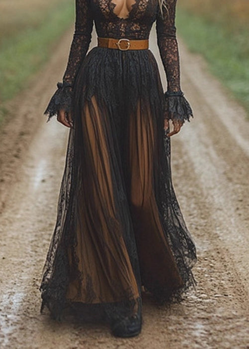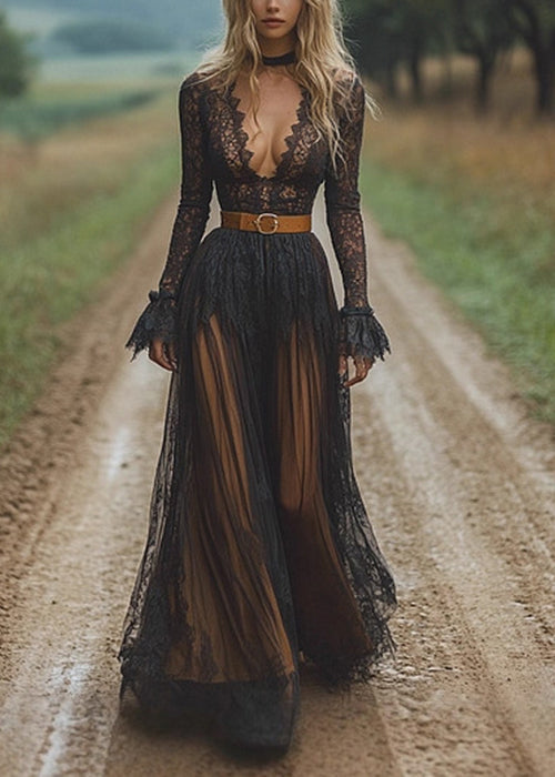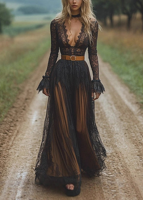 Slim Fit Black V Neck Hollow Out Lace Long Dress Spring