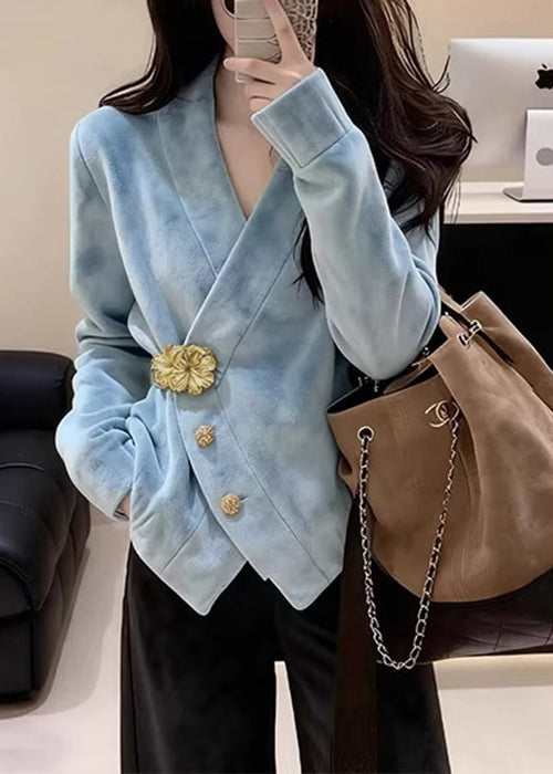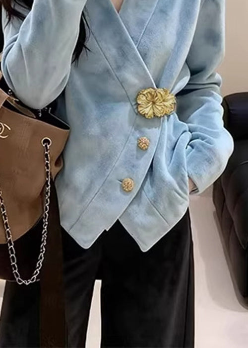 Stylish Blue V Neck Button Faux Suede Coats Spring