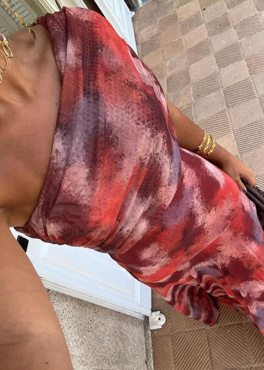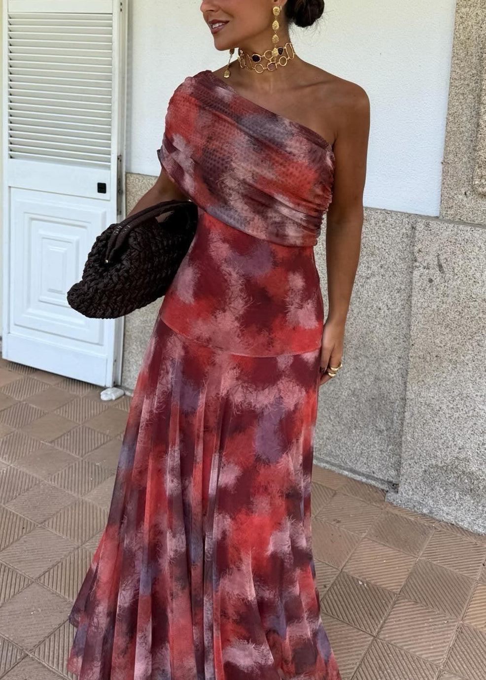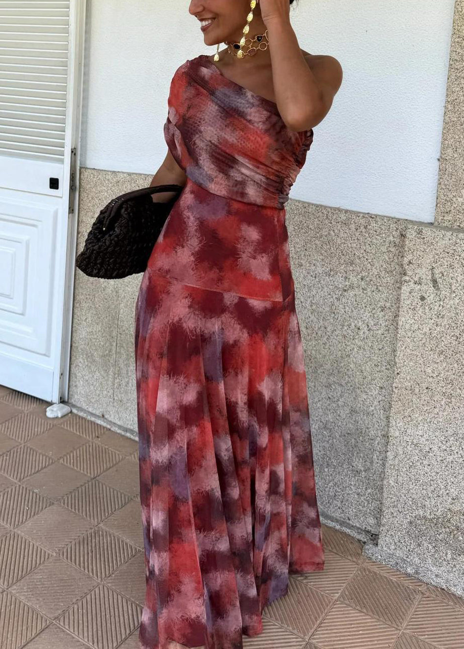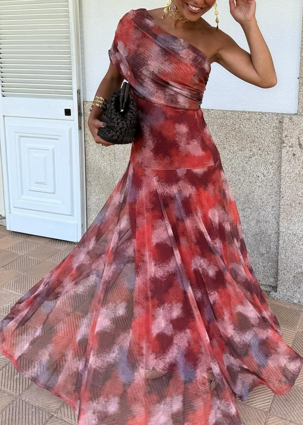 Stylish Red Cold Shoulder Print Tulle Long Dress Summer