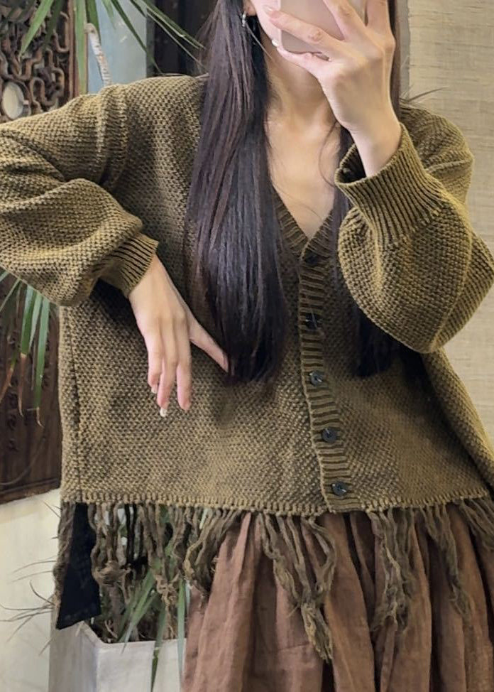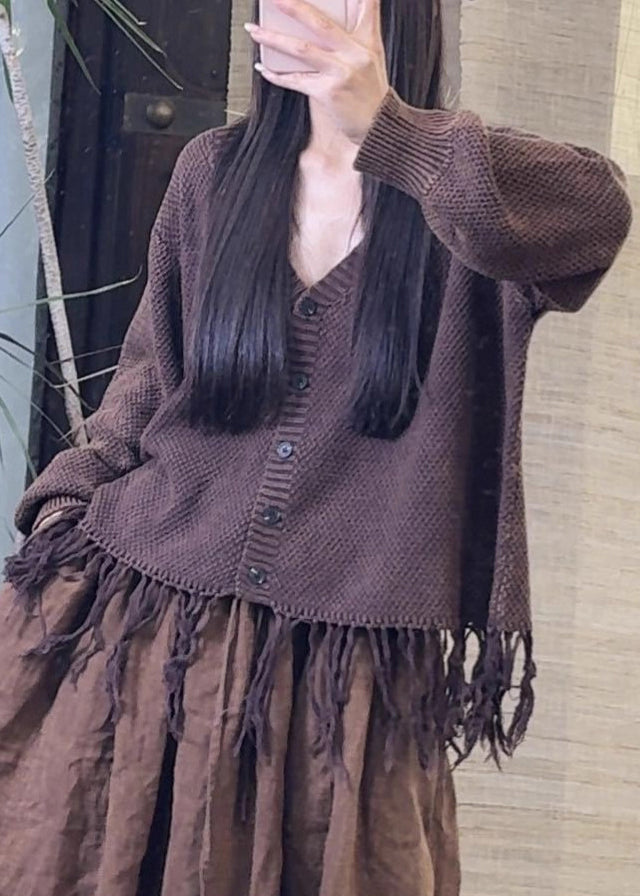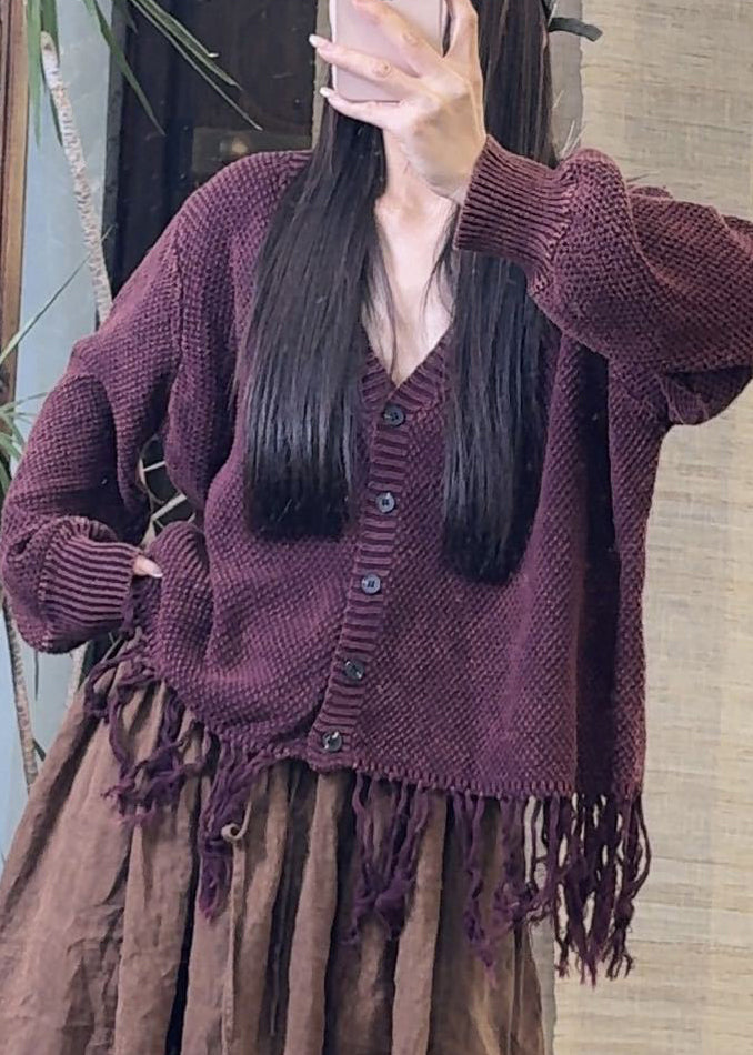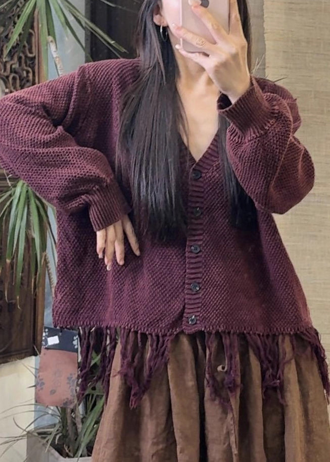 Vintage Red V Neck Button Tasseled Knit Sweater Spring
