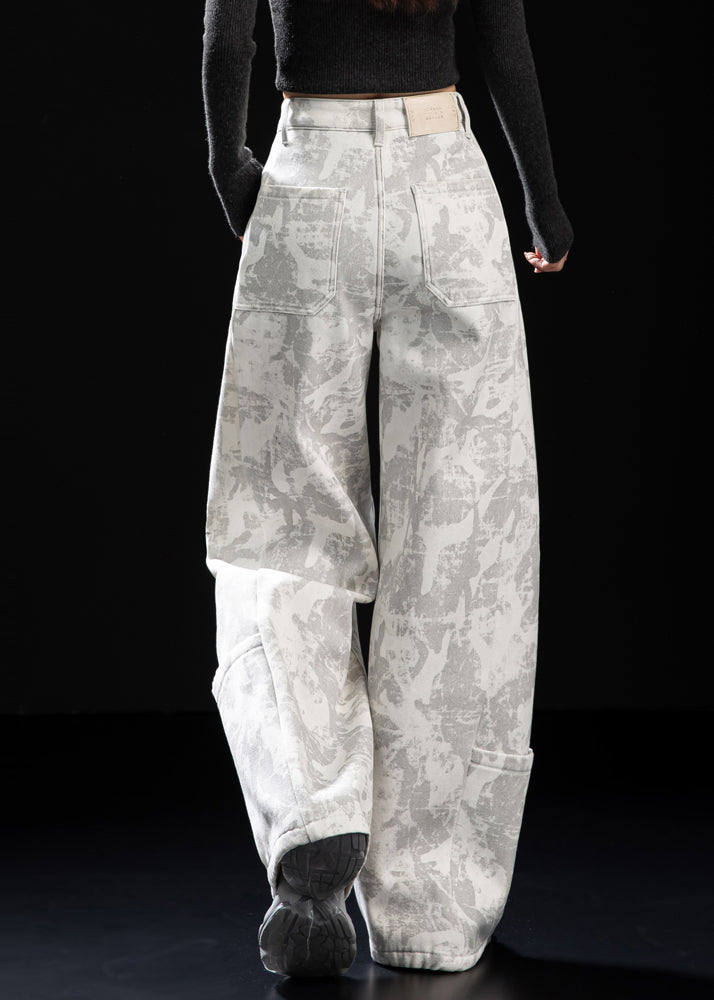 Italian White Tie Dye Patchwork Pockets Warm Fleece Pants Winter