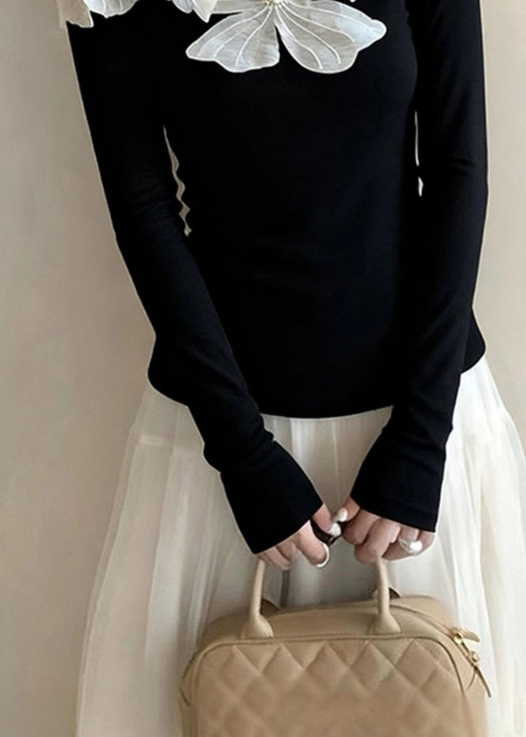Stylish Black Slash Neck Floral Nail Bead Knit Tops Spring