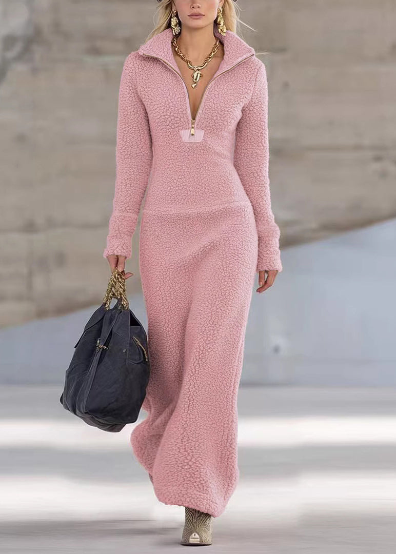 Women Khaki Zip Up Patchwork Faux Fur Long Dresses Winter