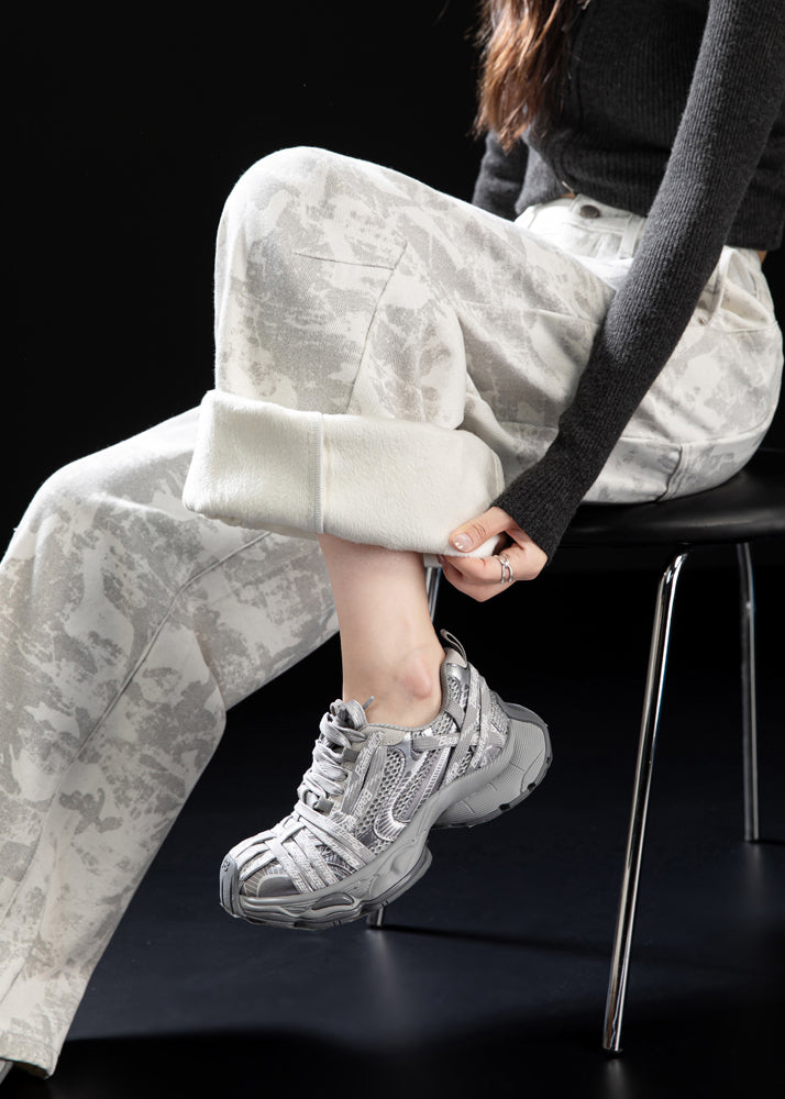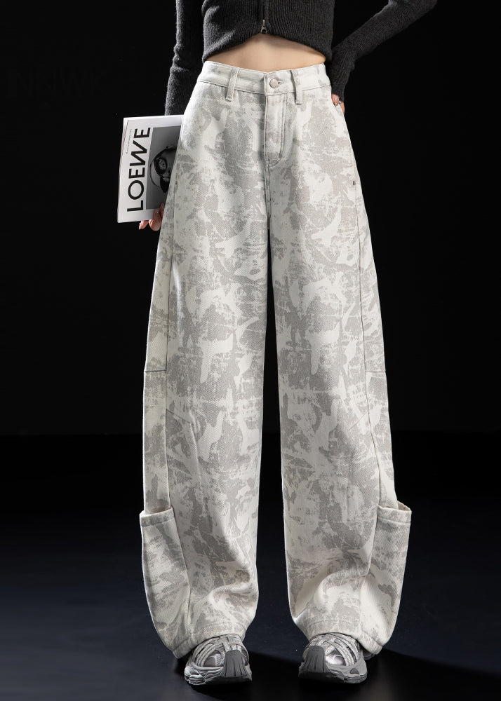 Italian White Tie Dye Patchwork Pockets Warm Fleece Pants Winter