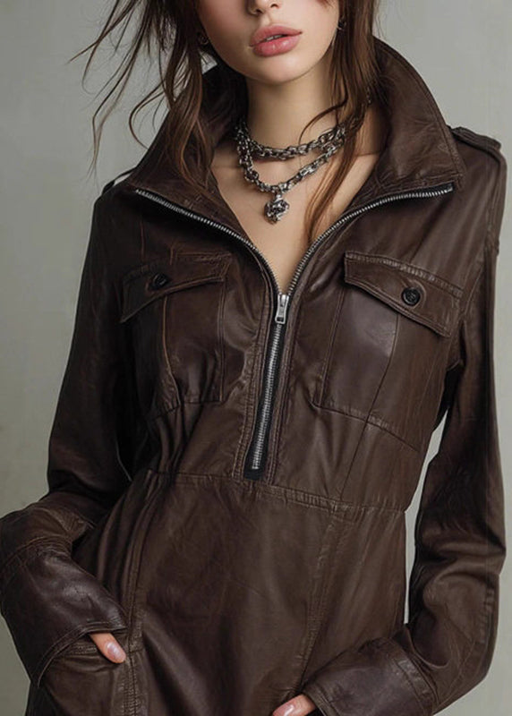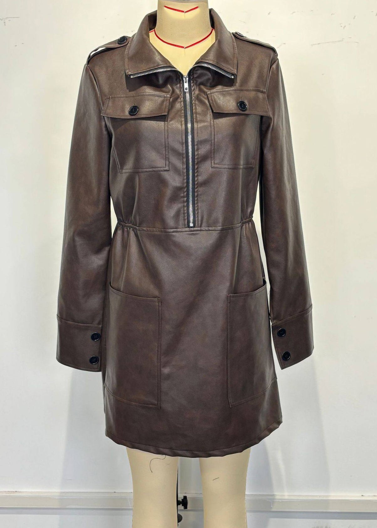 Women Coffee Peter Pan Collar Zippered Patchwork Faux Leather Mid Dress Spring