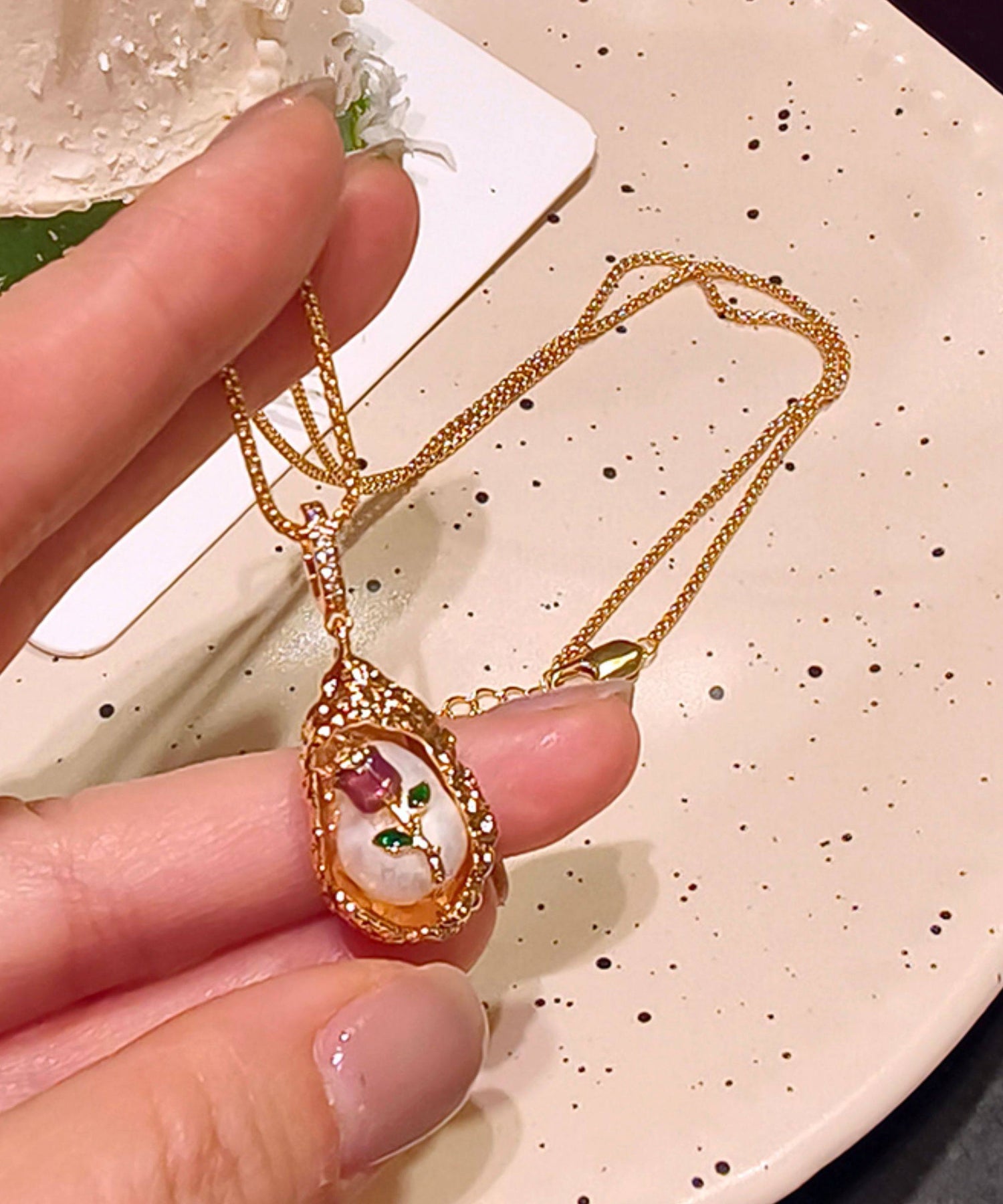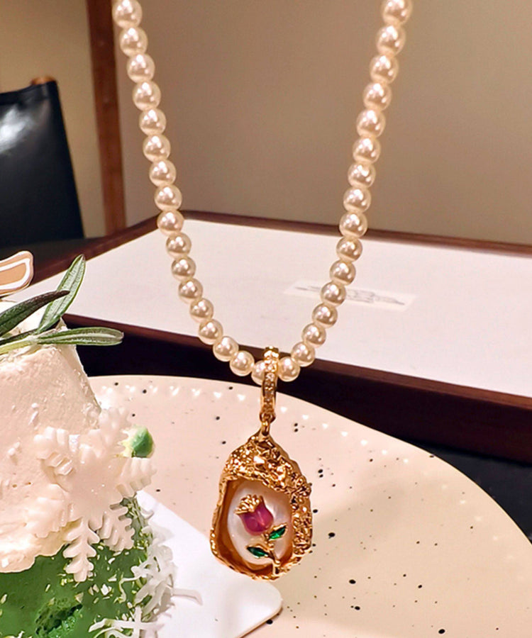 French Rose Gold Copper Overgild Rose Pearl Beading Pendant Necklace