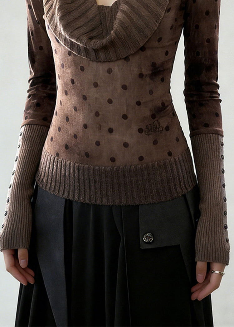Boutique Brown Turtle Neck Patchwork Cotton Shirt Top Spring