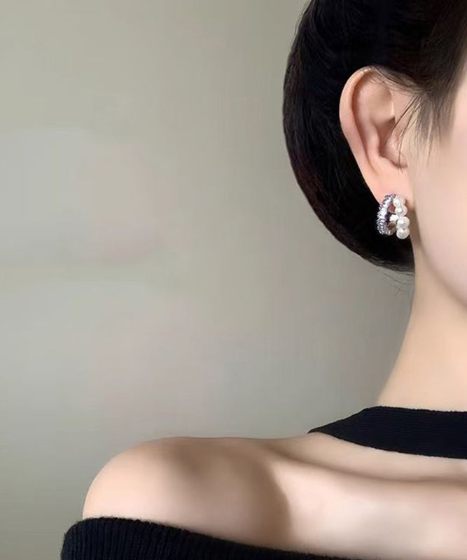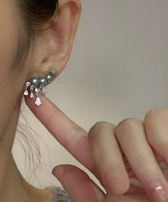 Style Grey Sterling Silver Zircon Arc Pearl Tassel Stud Earrings