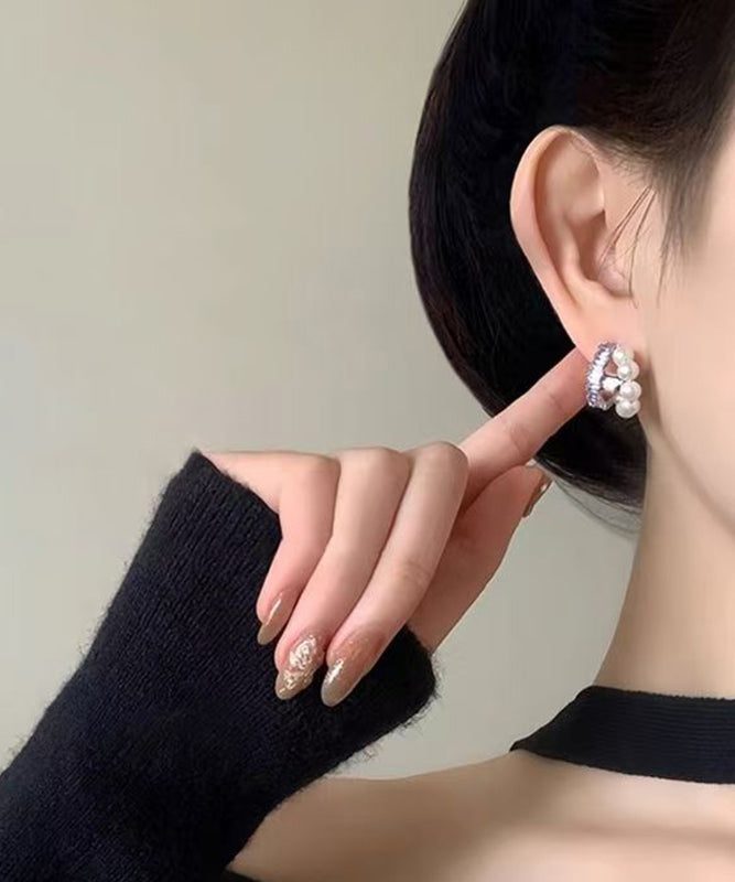 Art White Sterling Silver Overgild Zircon Pearl Love Stud Earrings