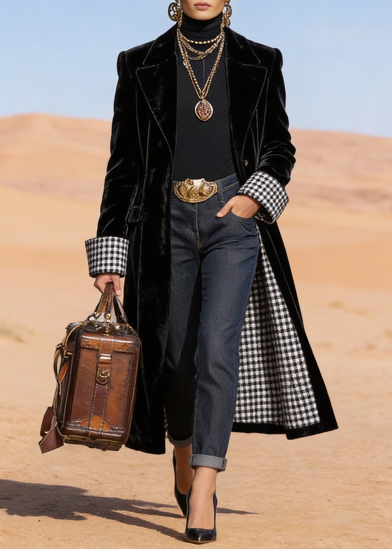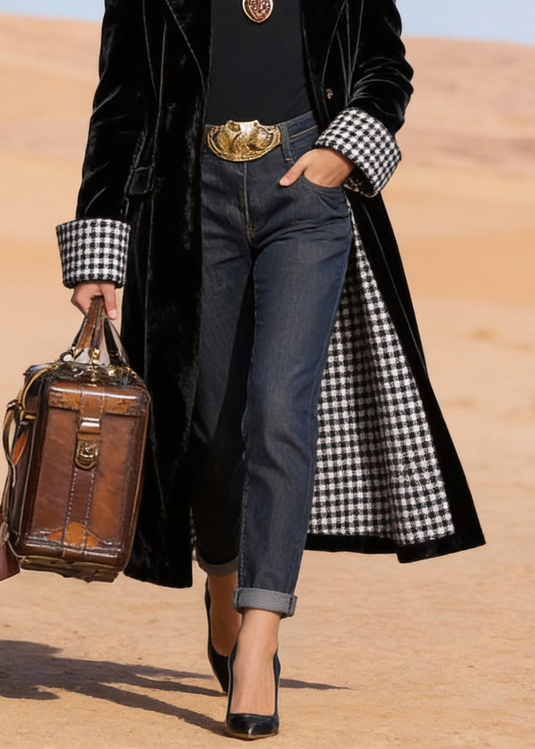 Plus Size Black Peter Pan Collar Pockets Velvet Trench Spring