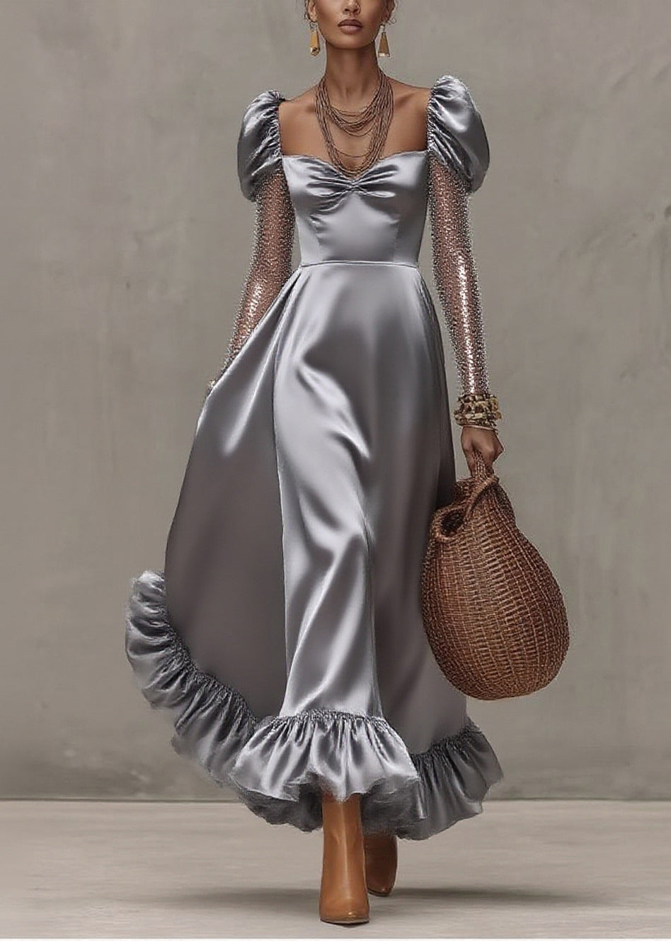 Classy Champagne Square Collar Exra Large Hem Silk Ankle Dress Summer