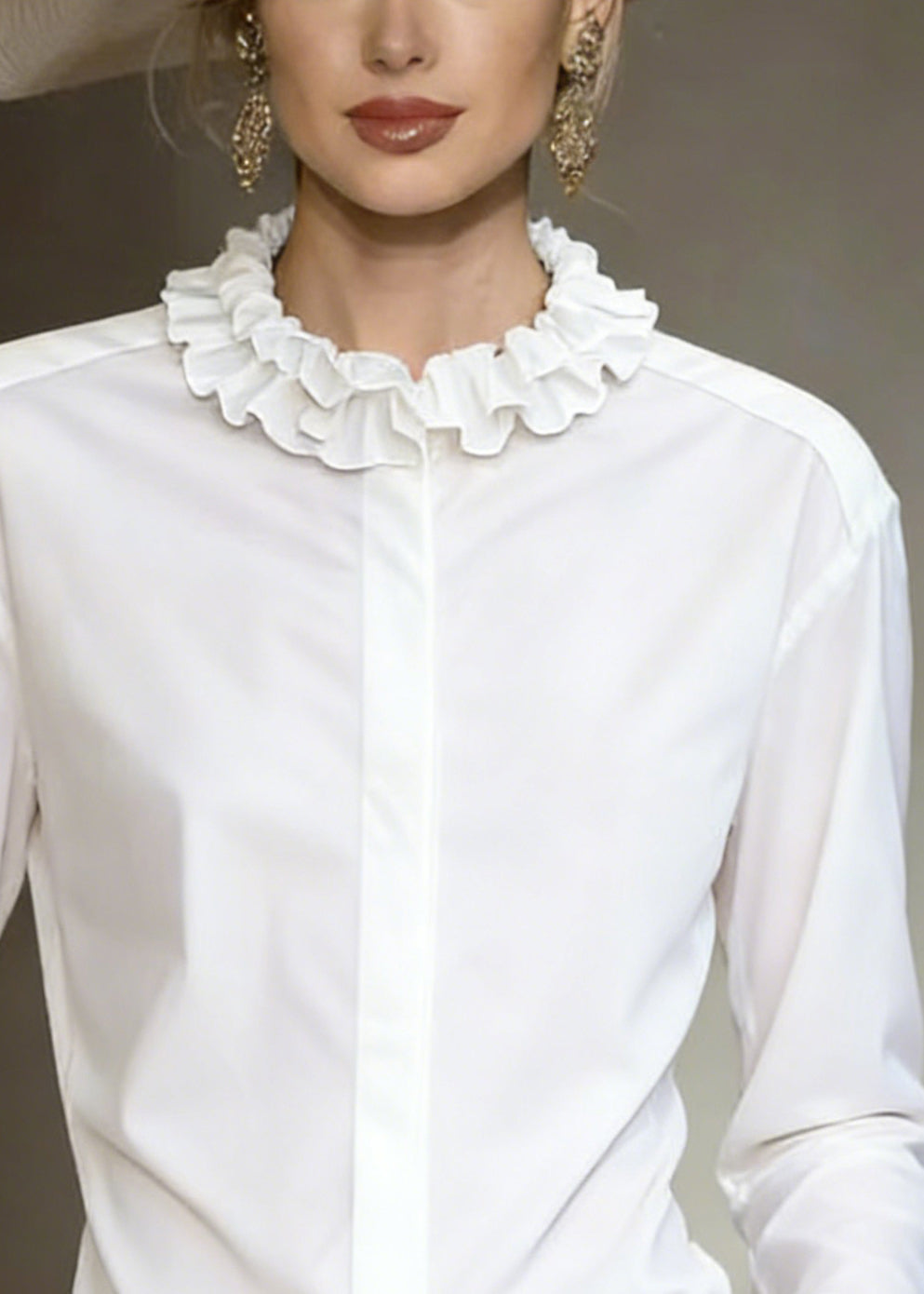 Stylish White Ruffled Button Solid Cotton Shirt Tops Fall