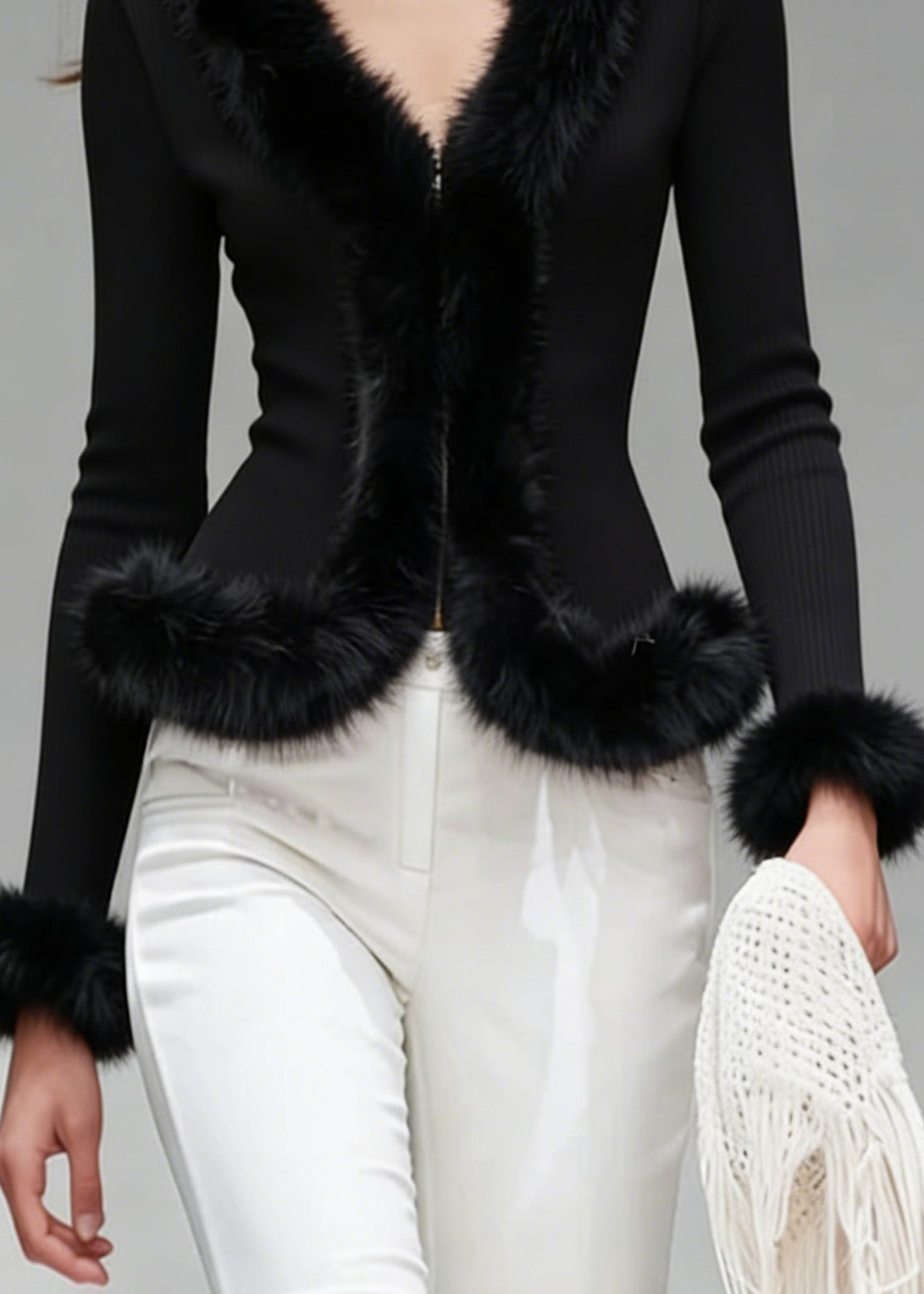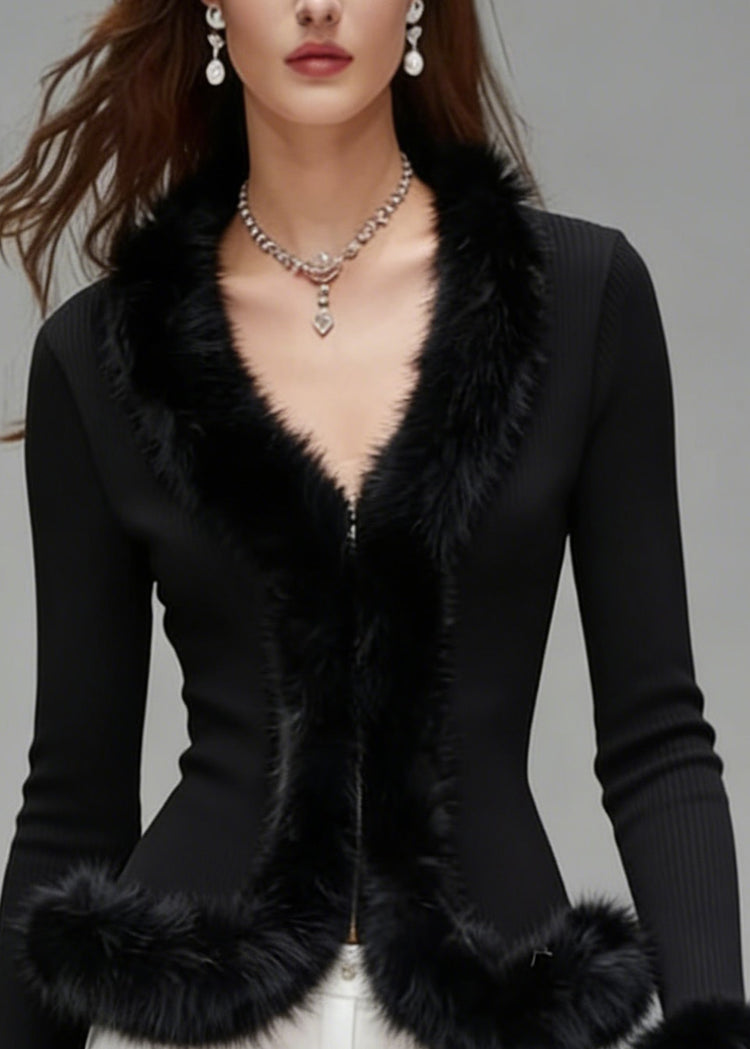 French Black V Neck Fur Patchwork Knit Blouses Spring