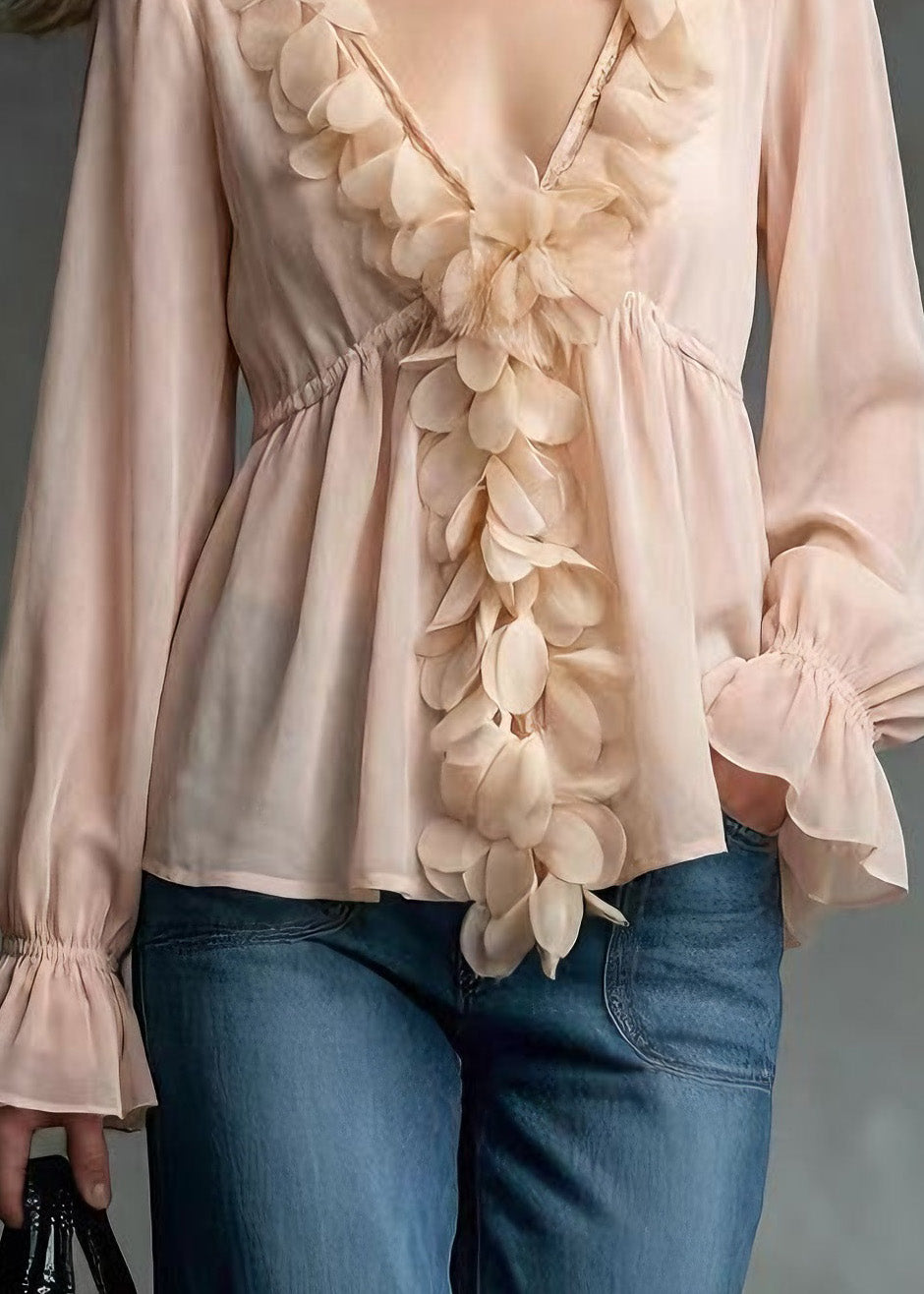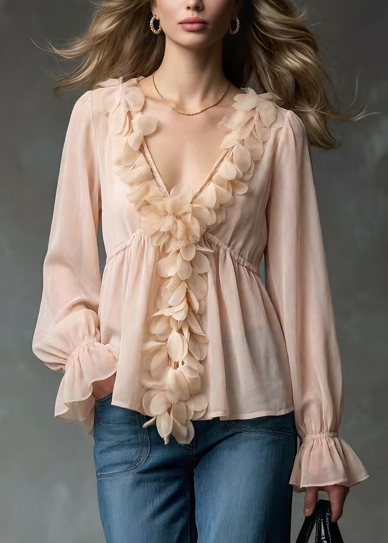 Art Pink V Neck Petal Chiffon Shirt Tops Spring