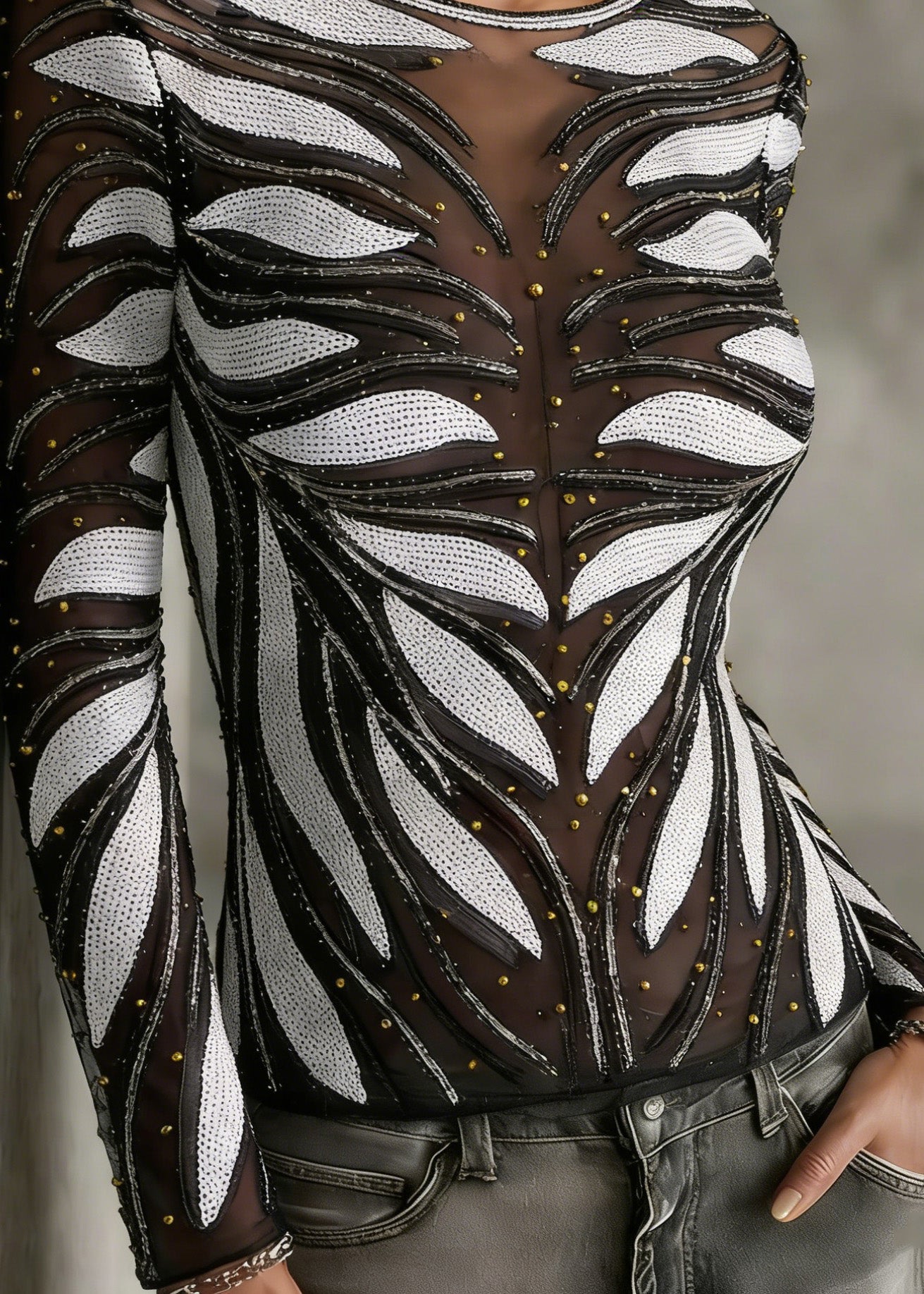 Chic Gold O Neck Nail Bead Slim Fit Tulle Top Spring