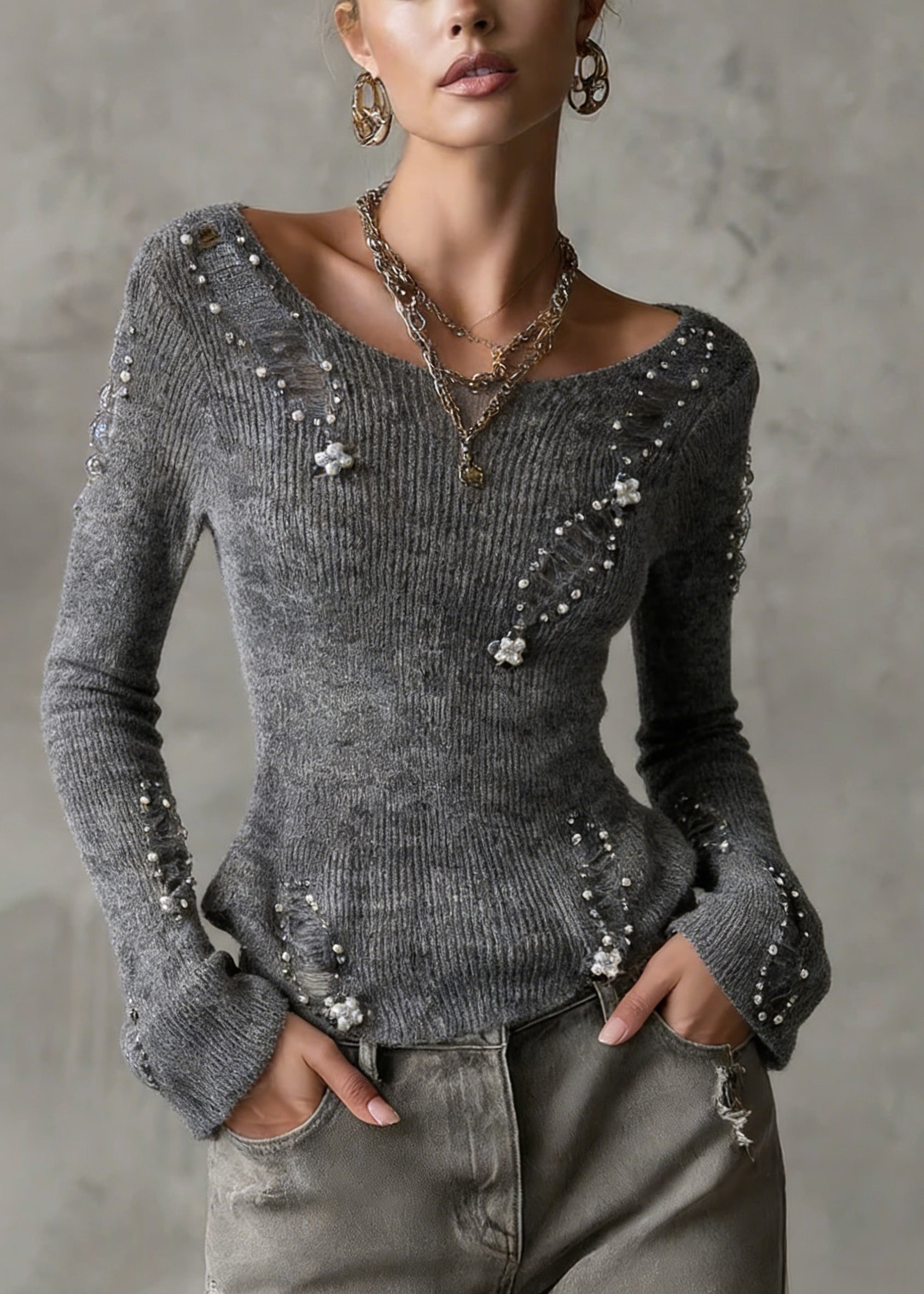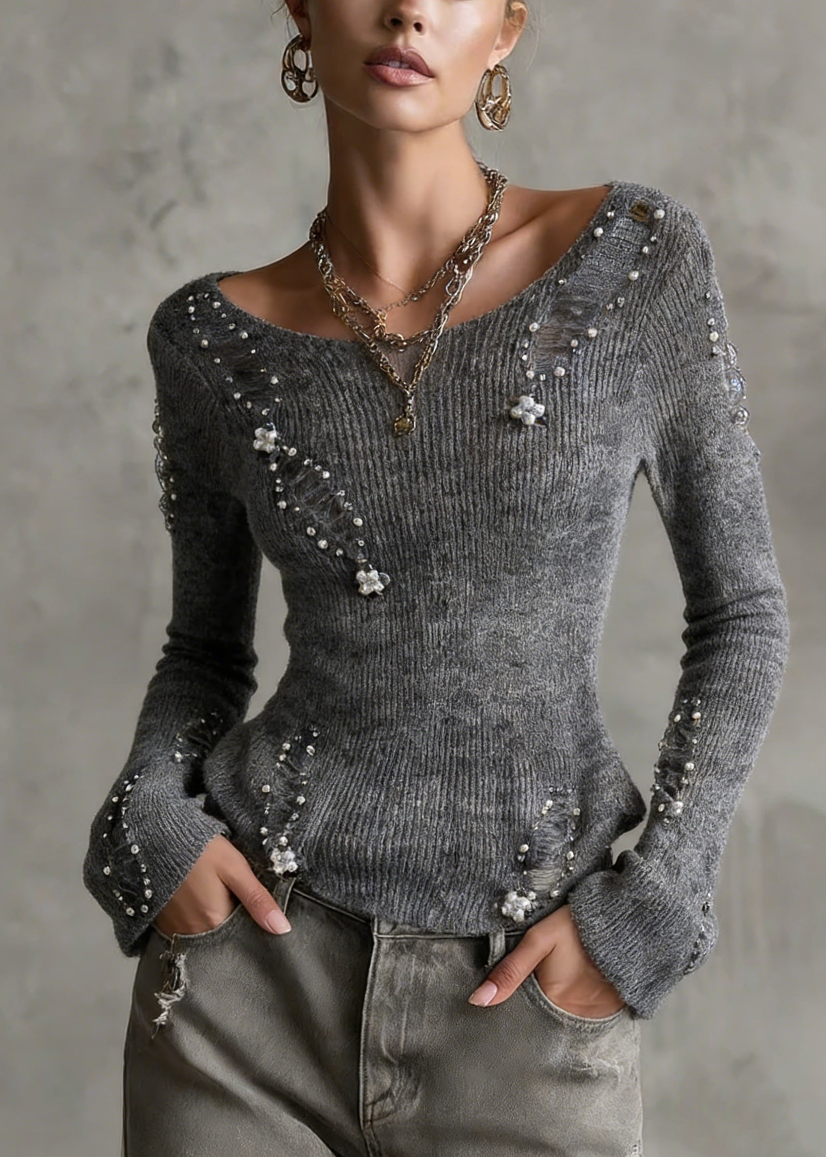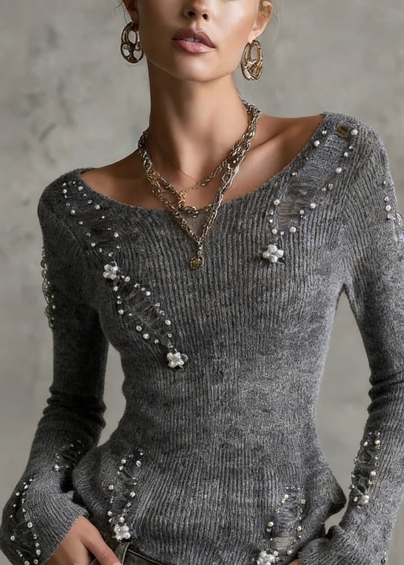 Unique Grey O Neck Nail Bead Zircon Knit Top Spring