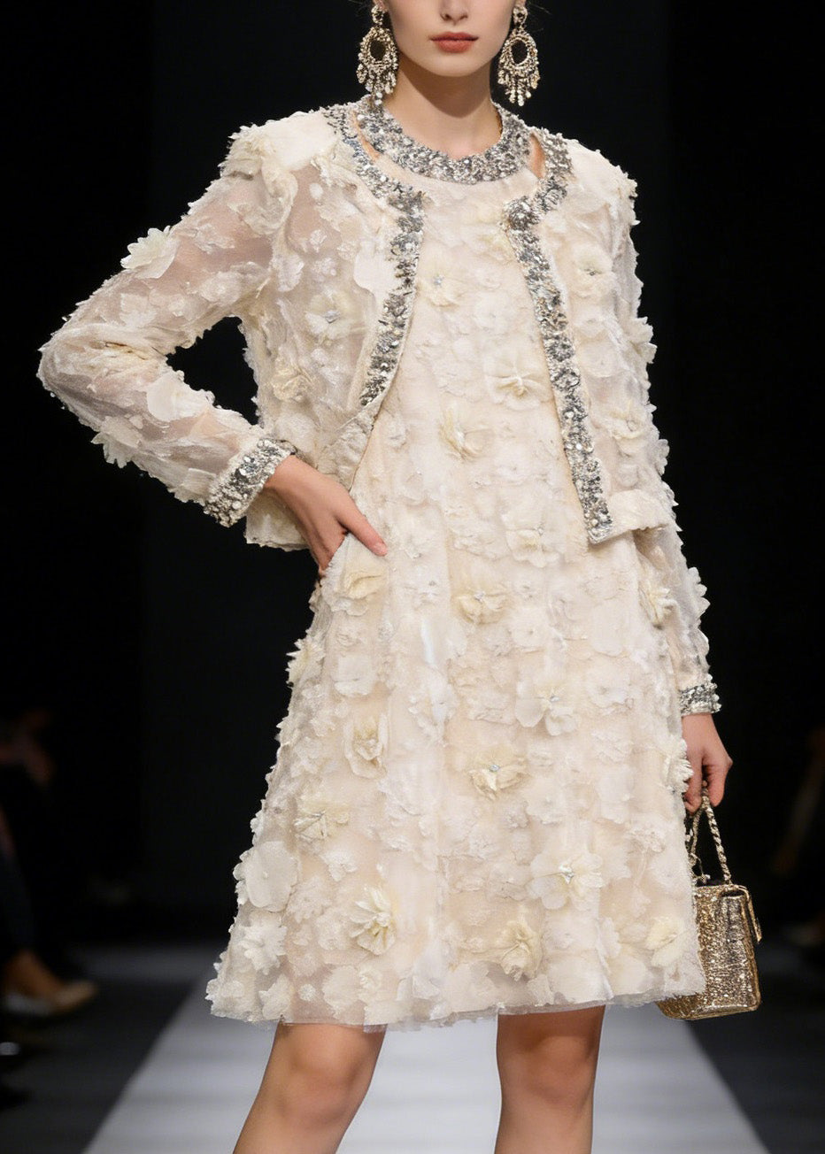 Fashion Apricot Floral Coat And Dress Tulle Two Piece Suit Set Spring