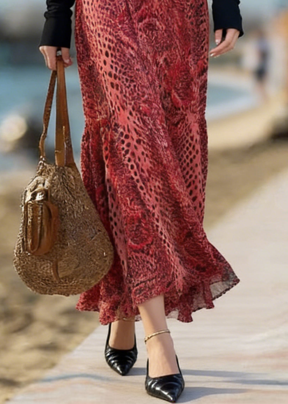 Boho Red Pockets Print Elastic Waist Maxi Skirt Spring
