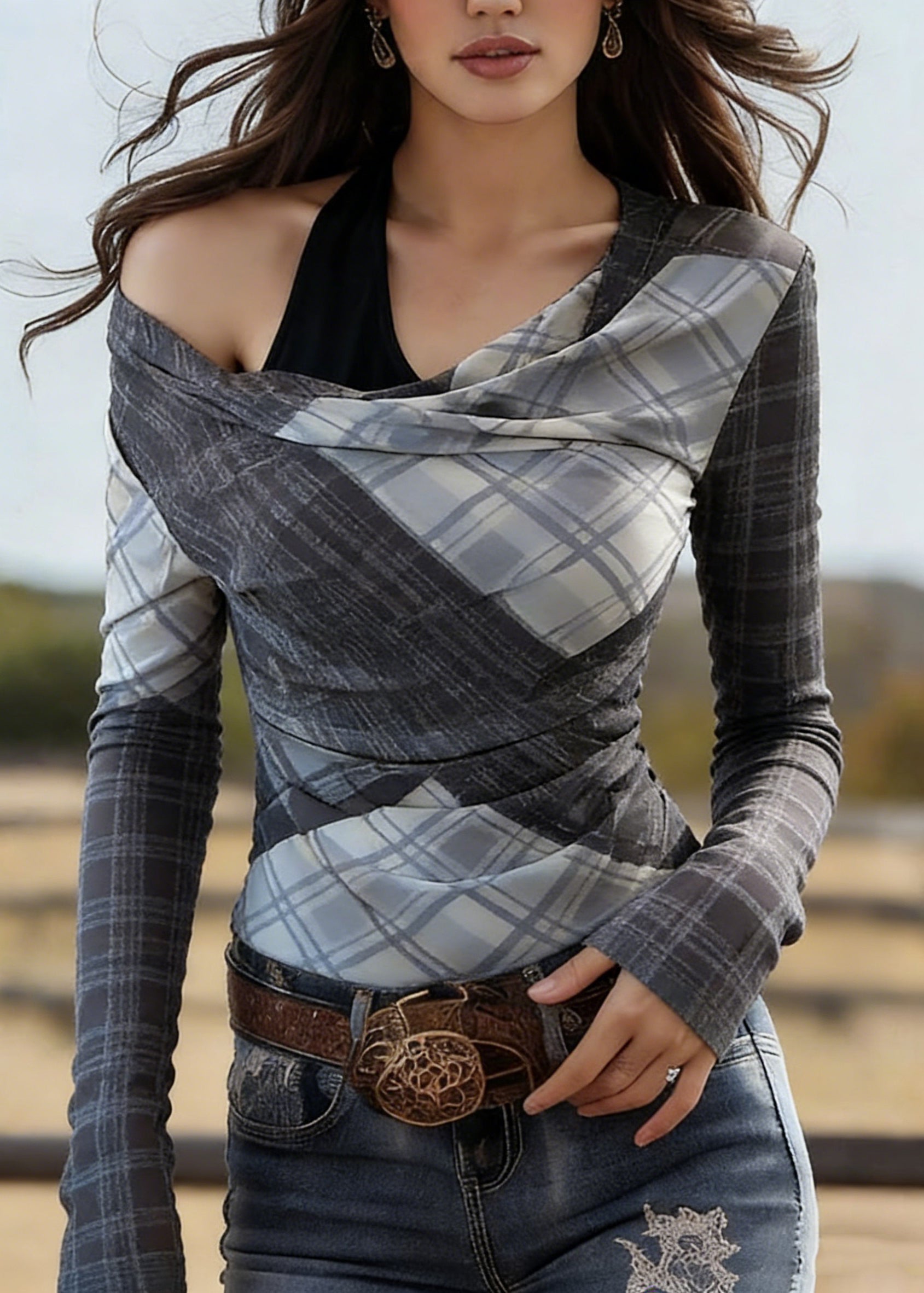 Sexy Plaid Asymmetrical Cold Shoulder Chiffon Top Spring