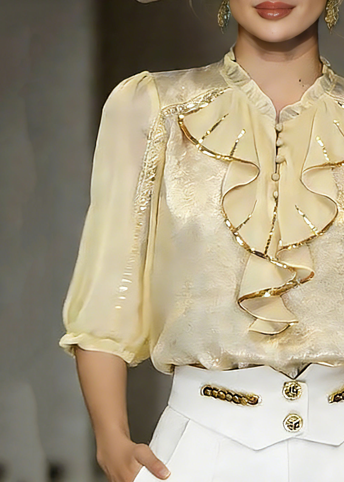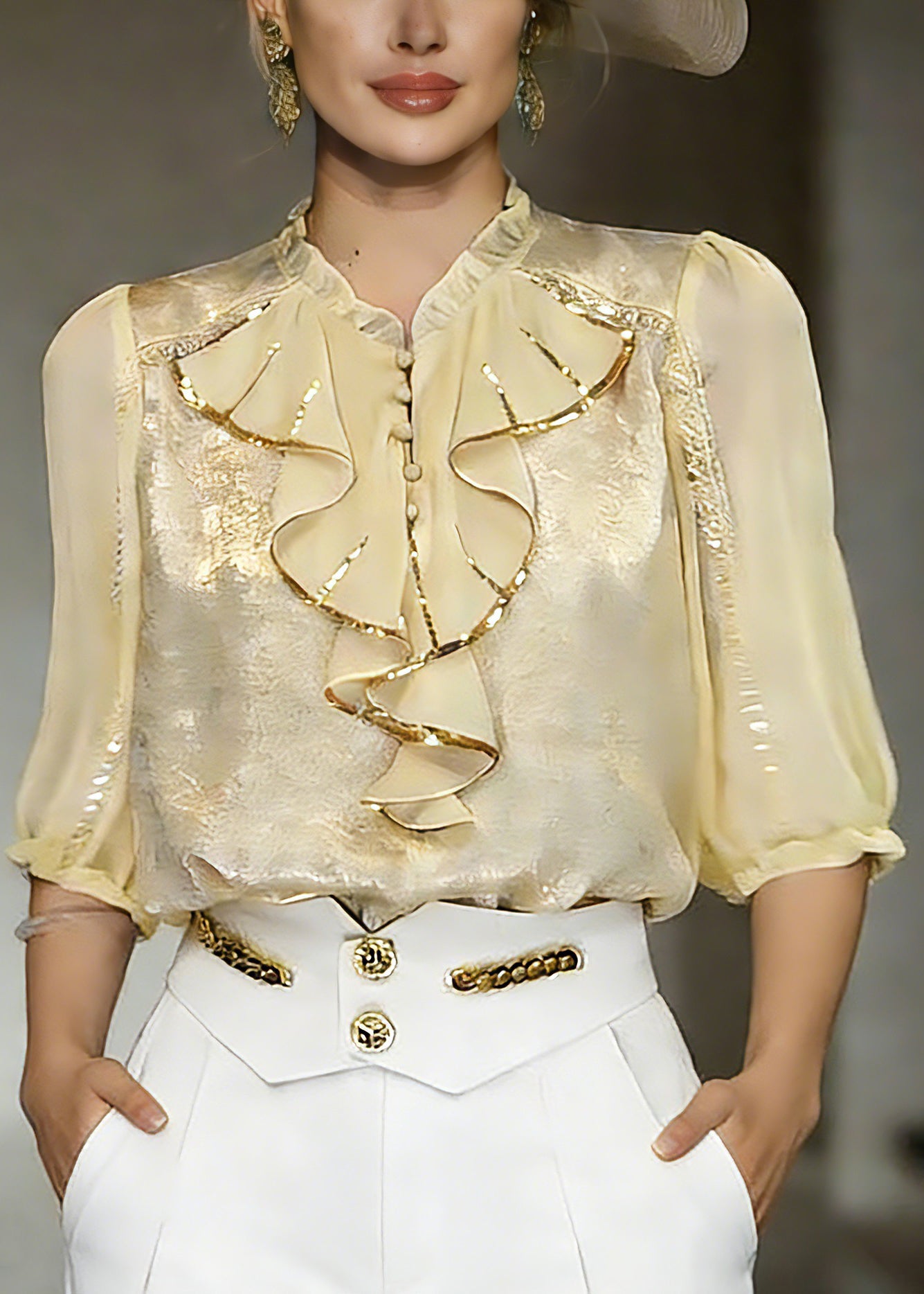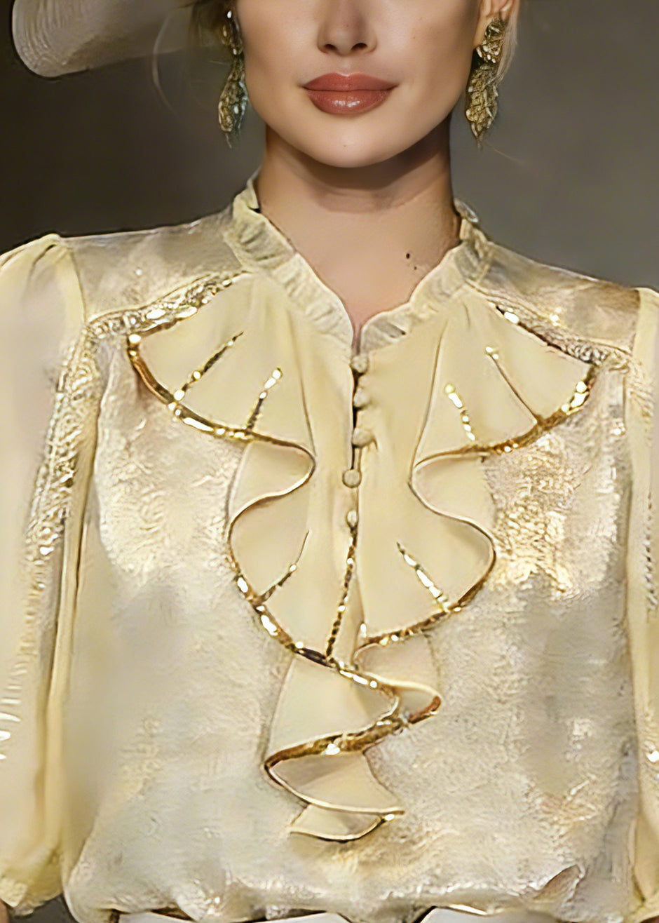 Beautiful Yellow Stand Collar Ruffled Chiffon Shirt Summer