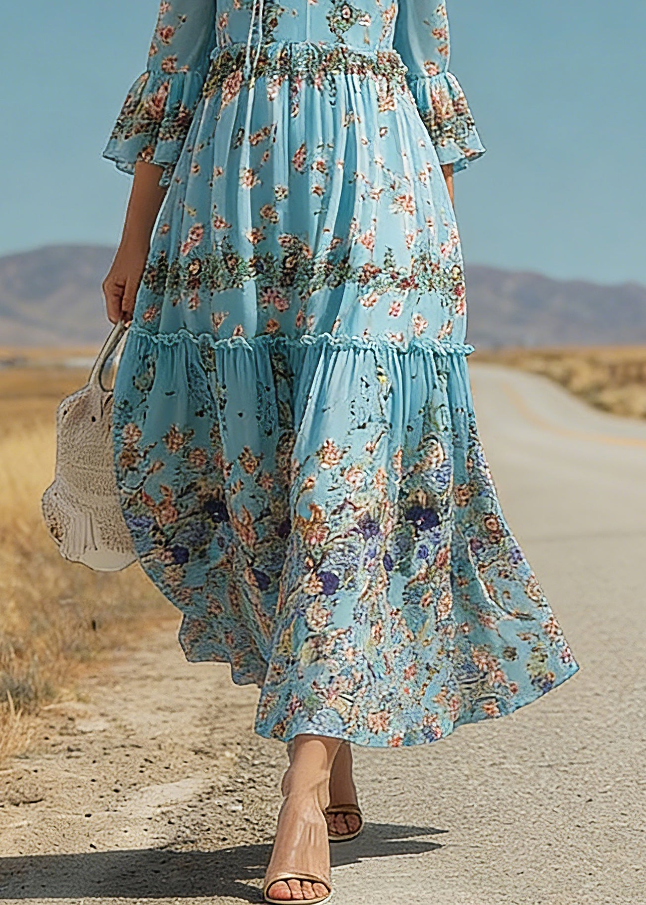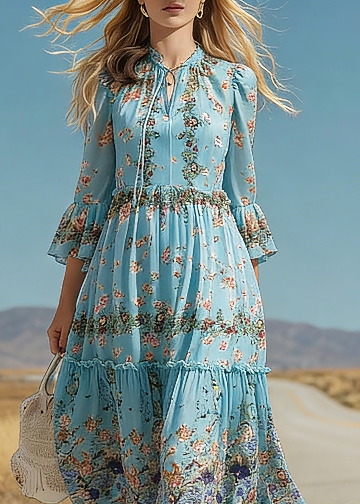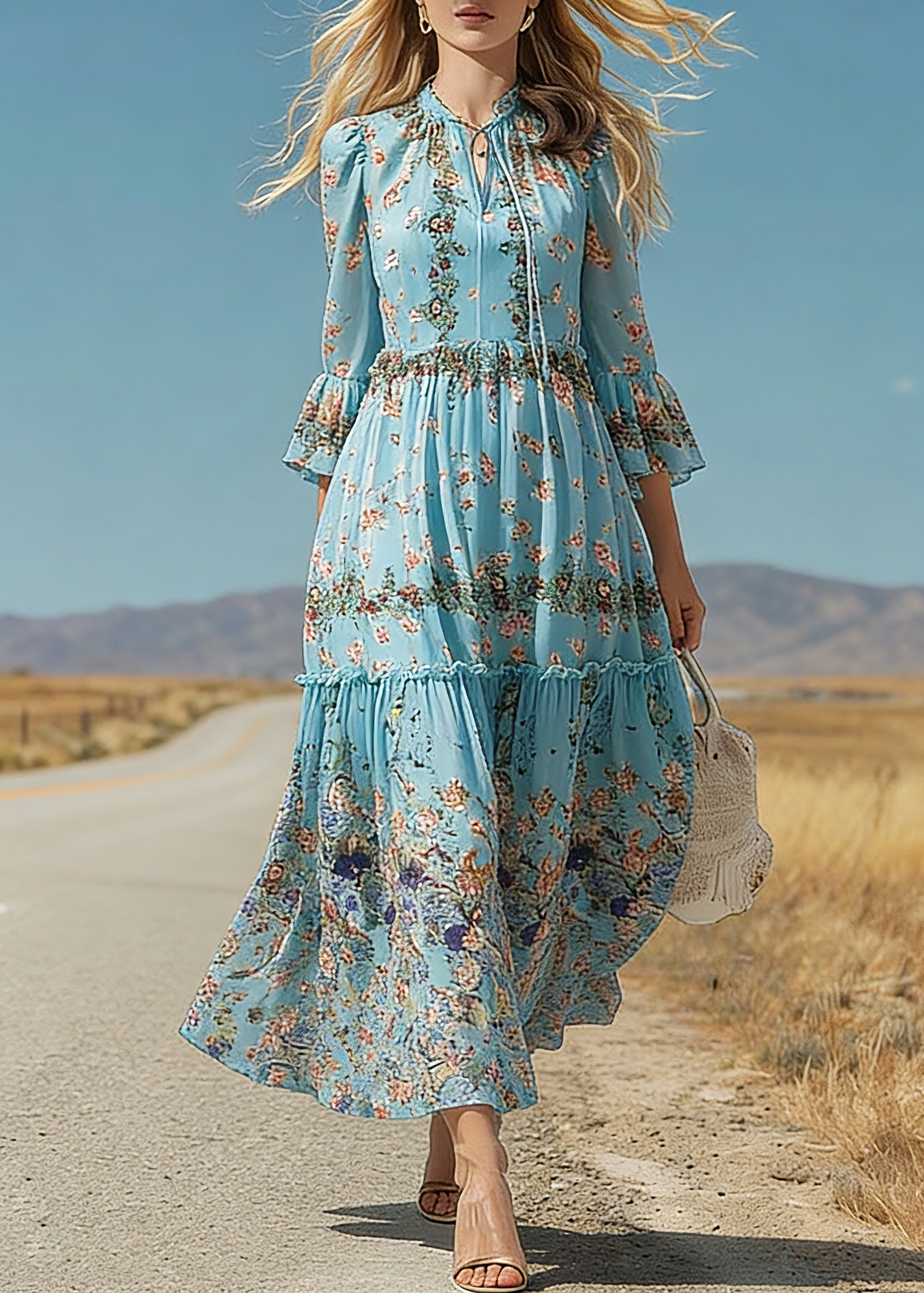 Boho Blue Ruffled Patchwork Print Silk Maxi Dress Flare Sleeve