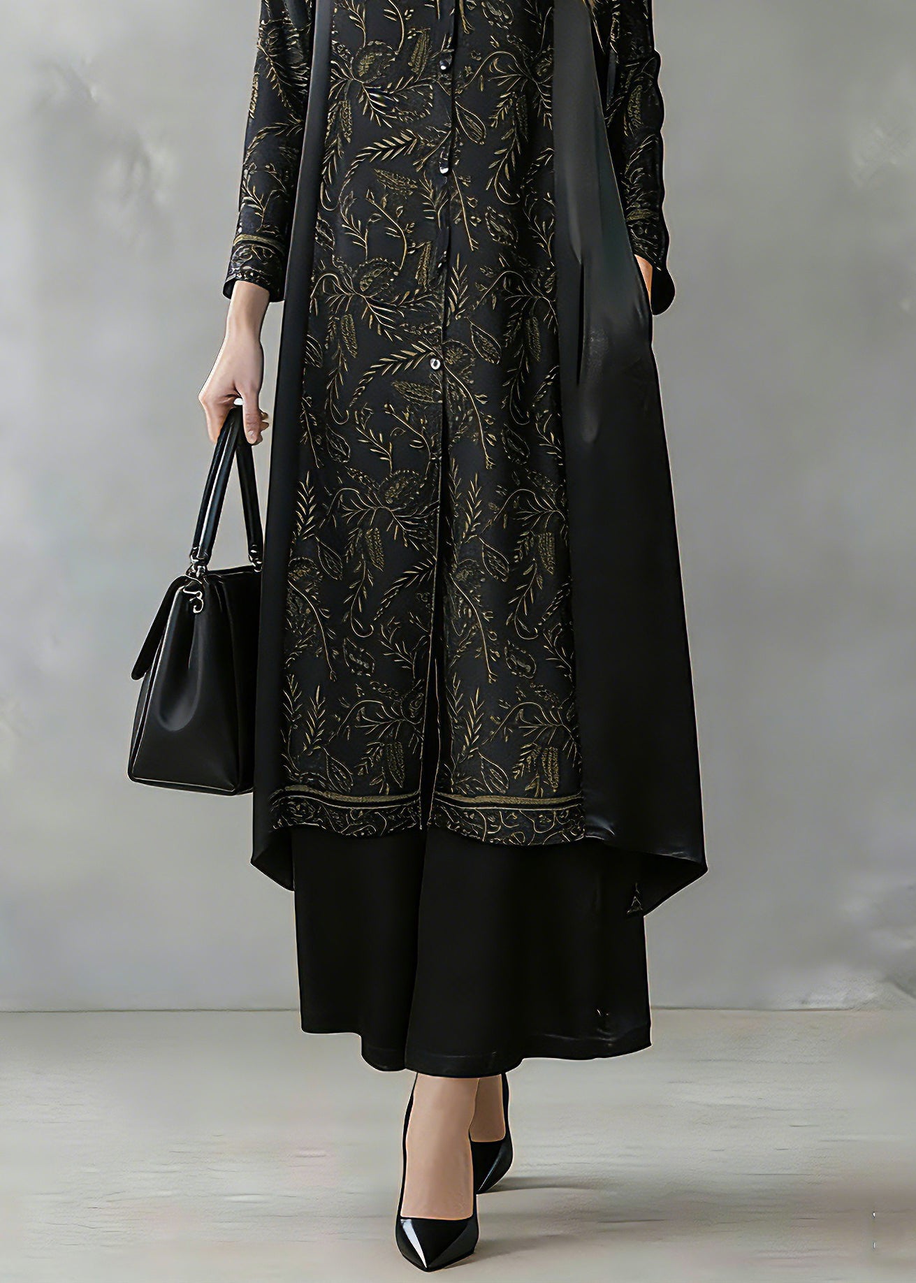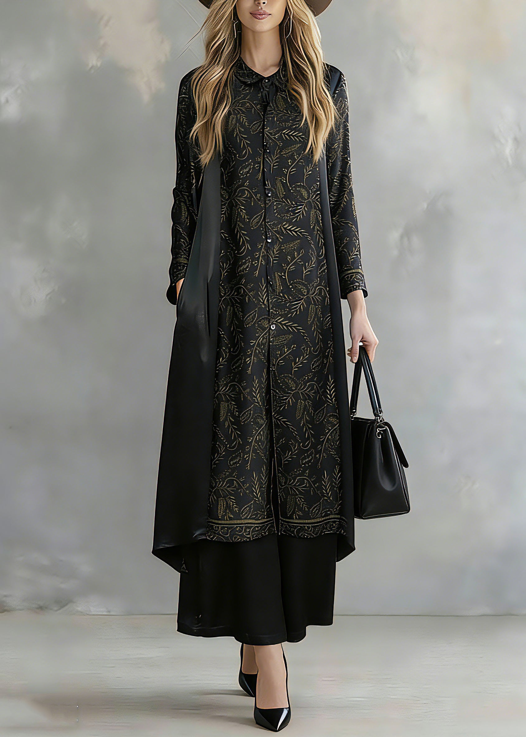 Elegant Black Print Button Silk Long Shirts And Wide Leg Pants Two Piece Set Long Sleeve