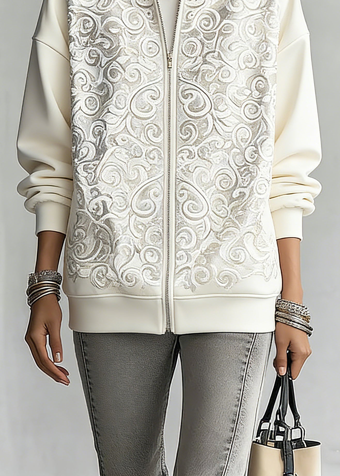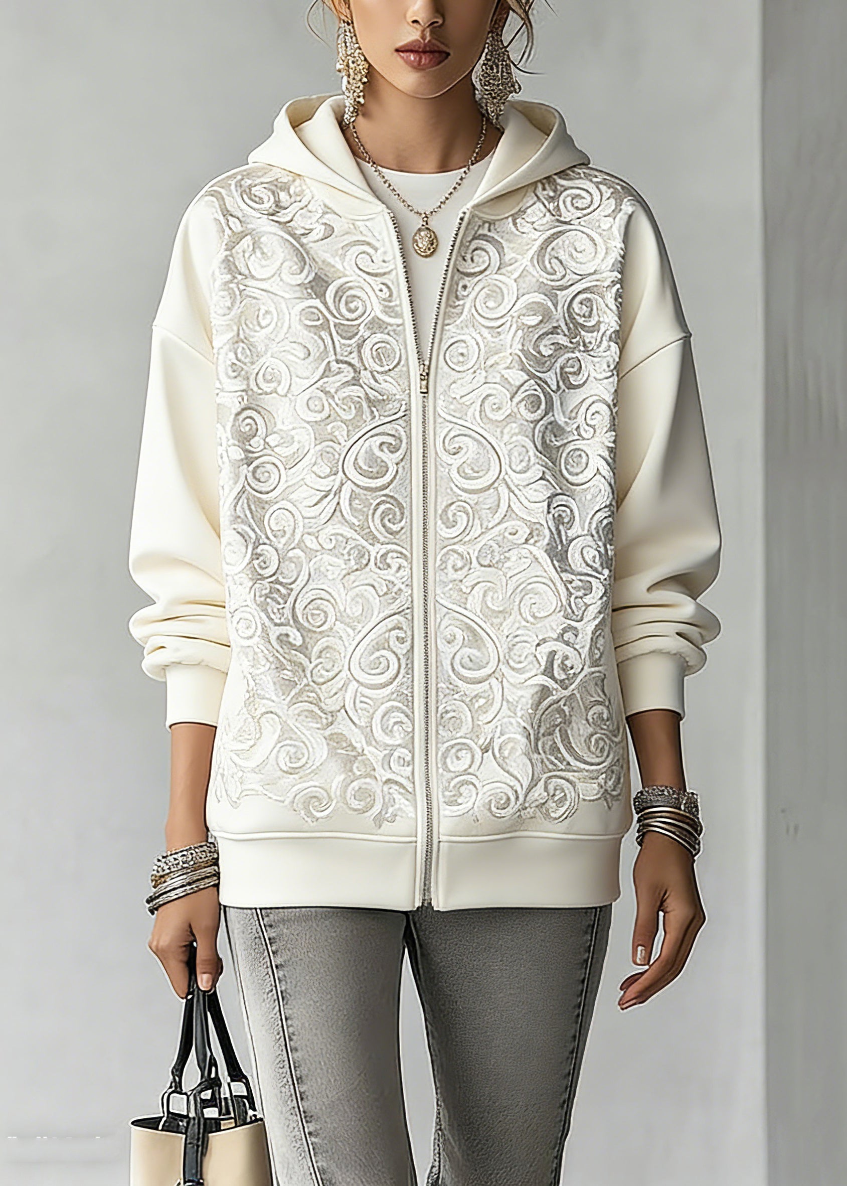 Fashion White Print Zippered Hoodies Fall Outwear