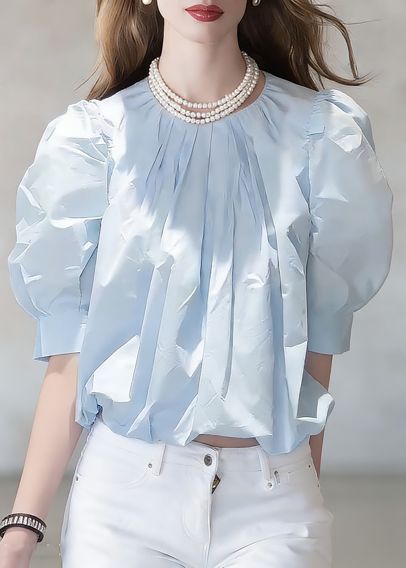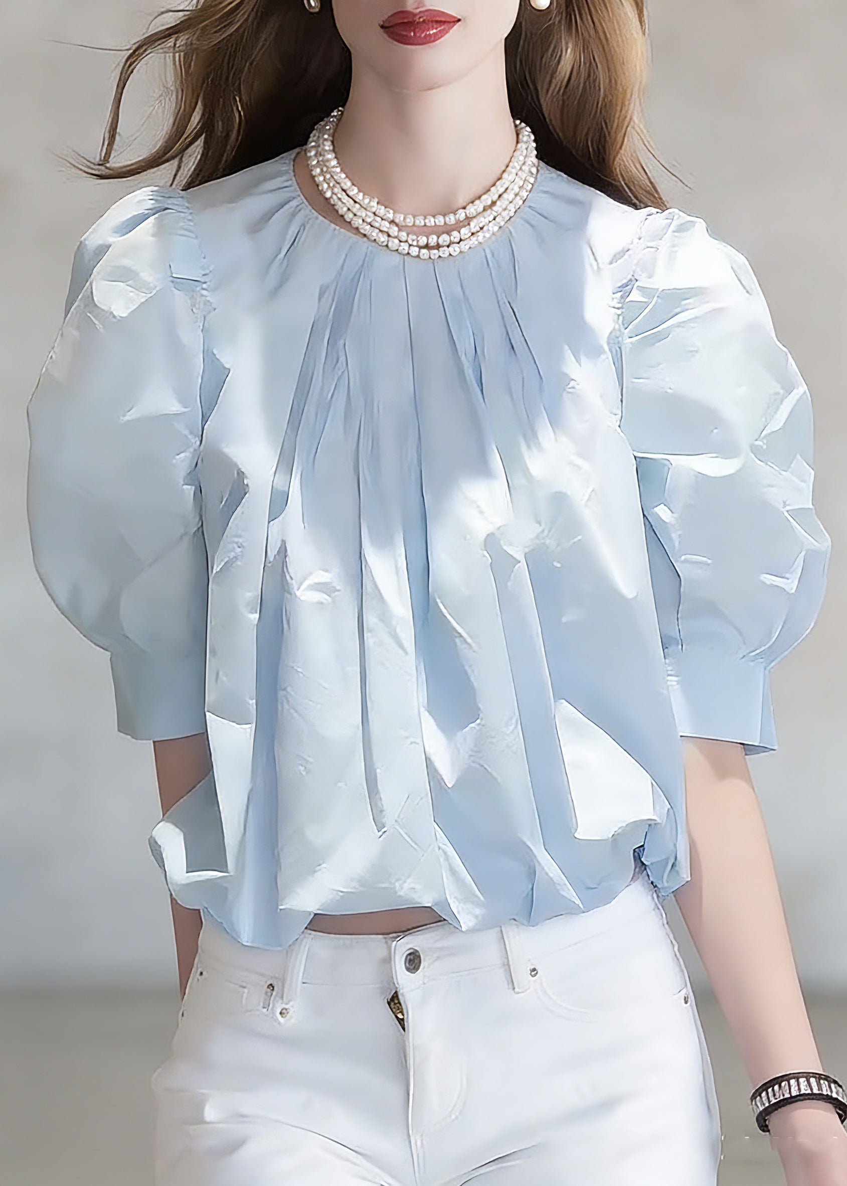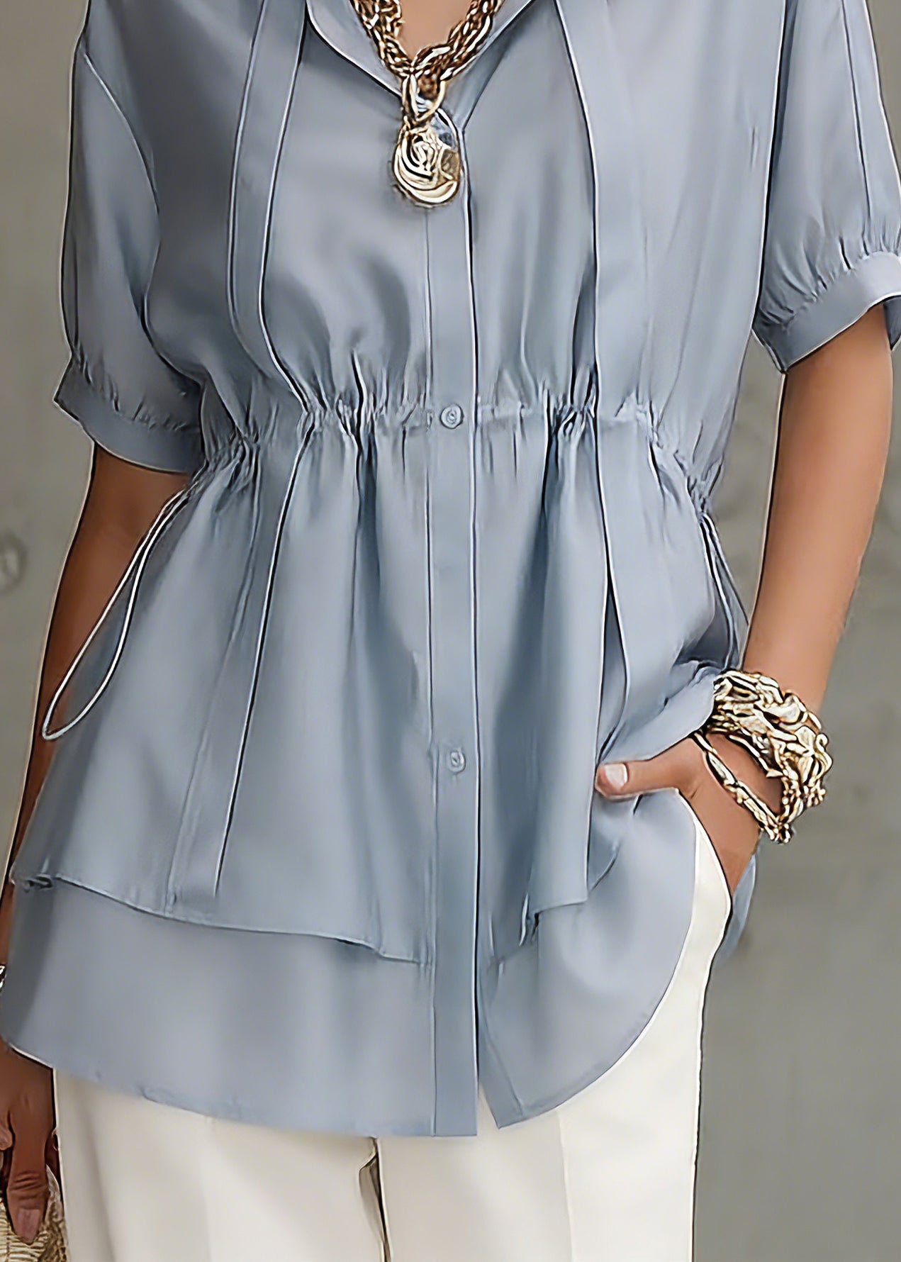 Fine Blue Peter Pan Collar Drawstring Silk Cotton Shirts Short Sleeve