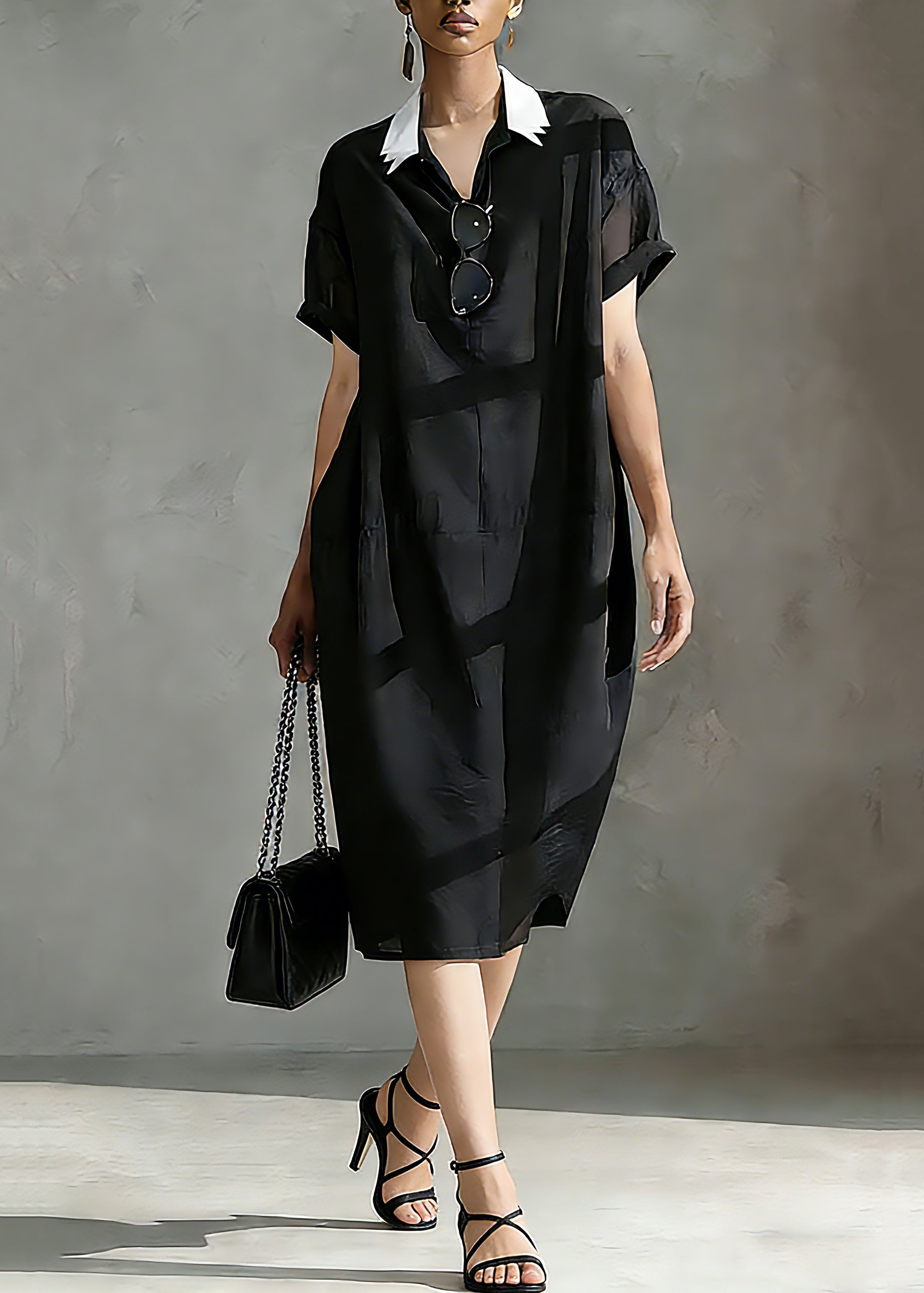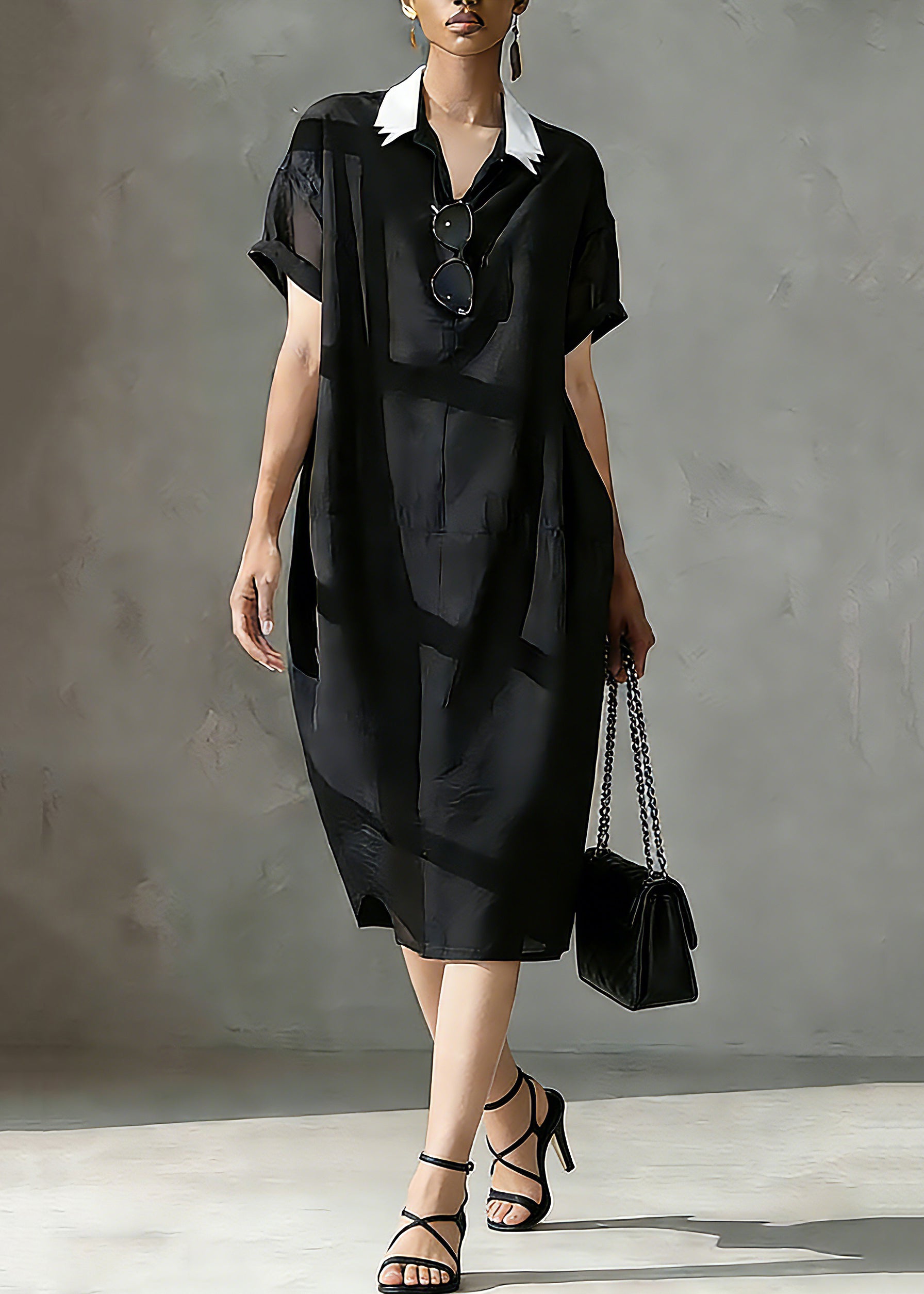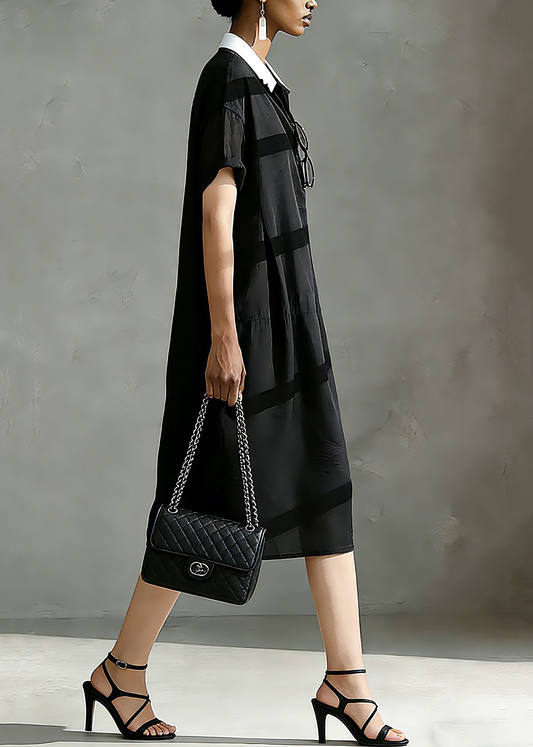 Italian Black Peter Pan Collar Patchwork Vacation Long Dresses Short Sleeve