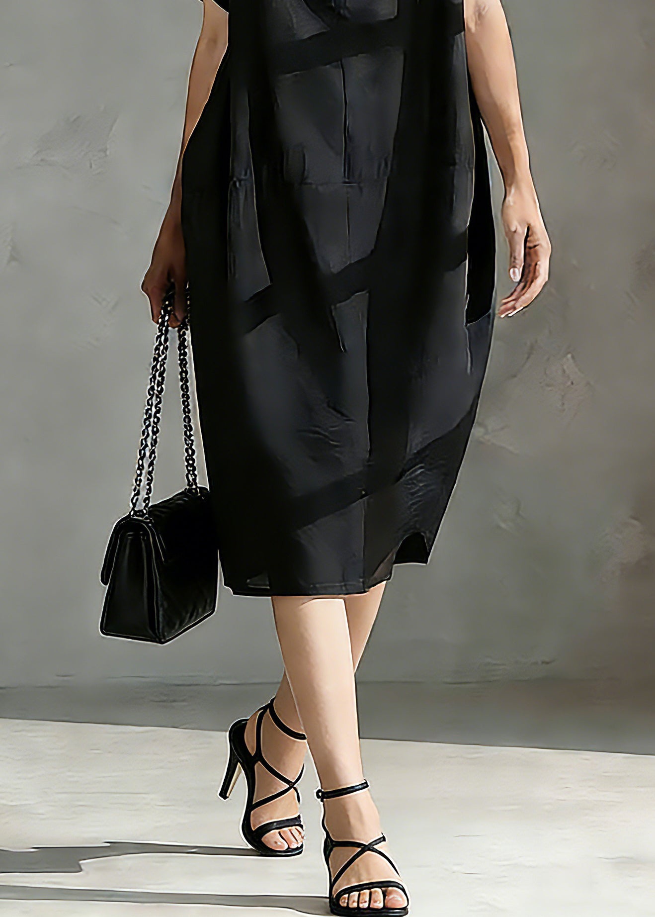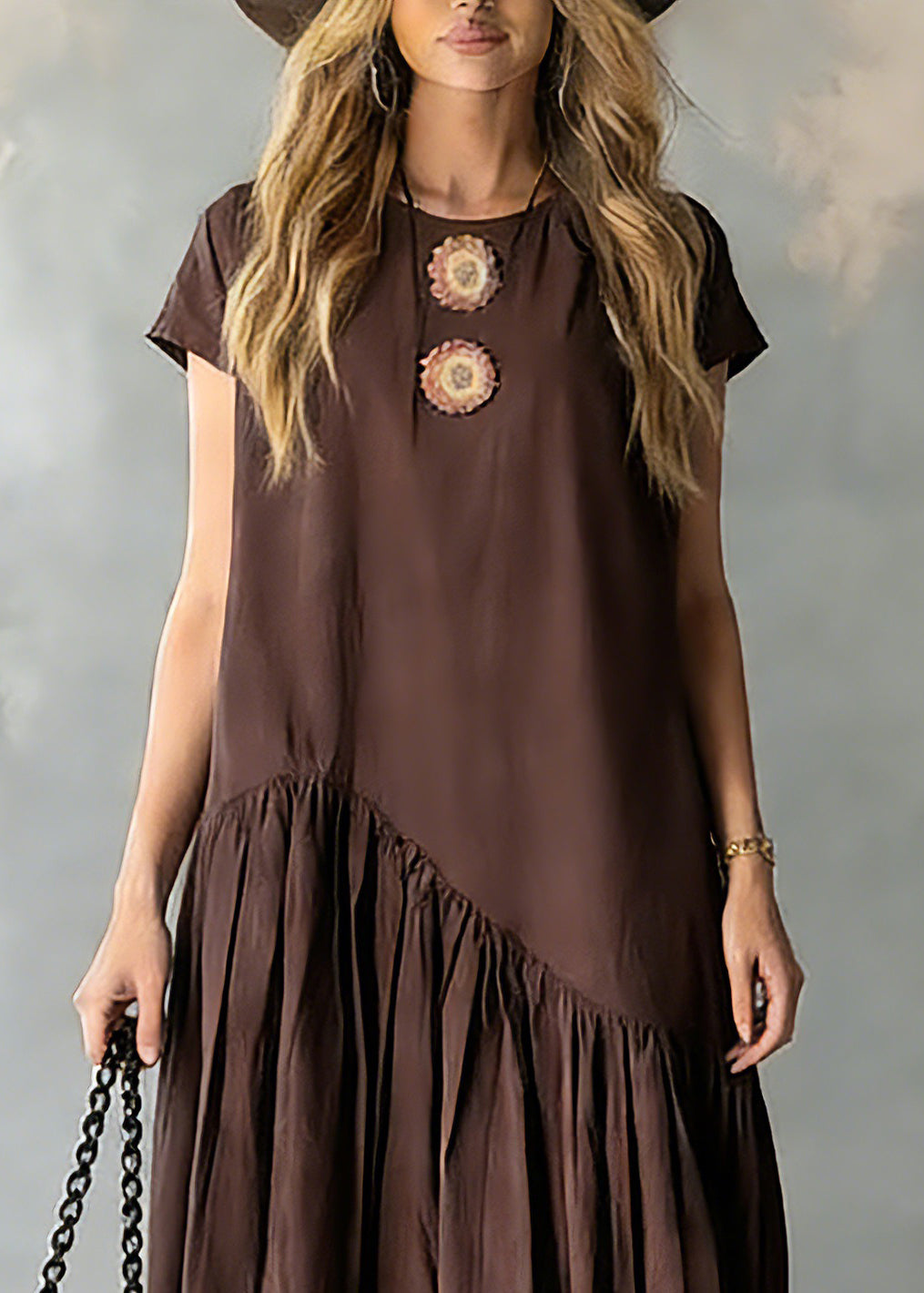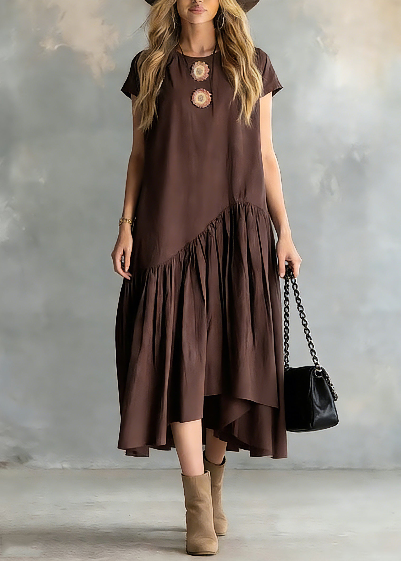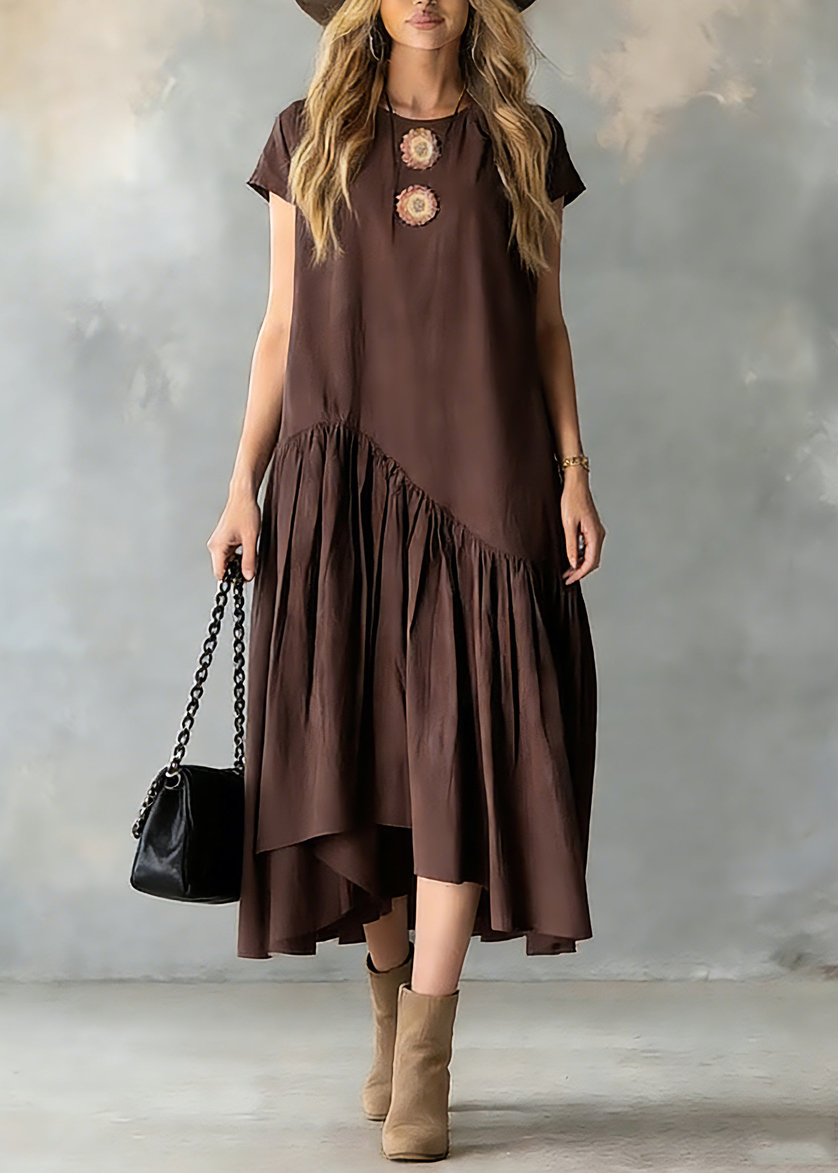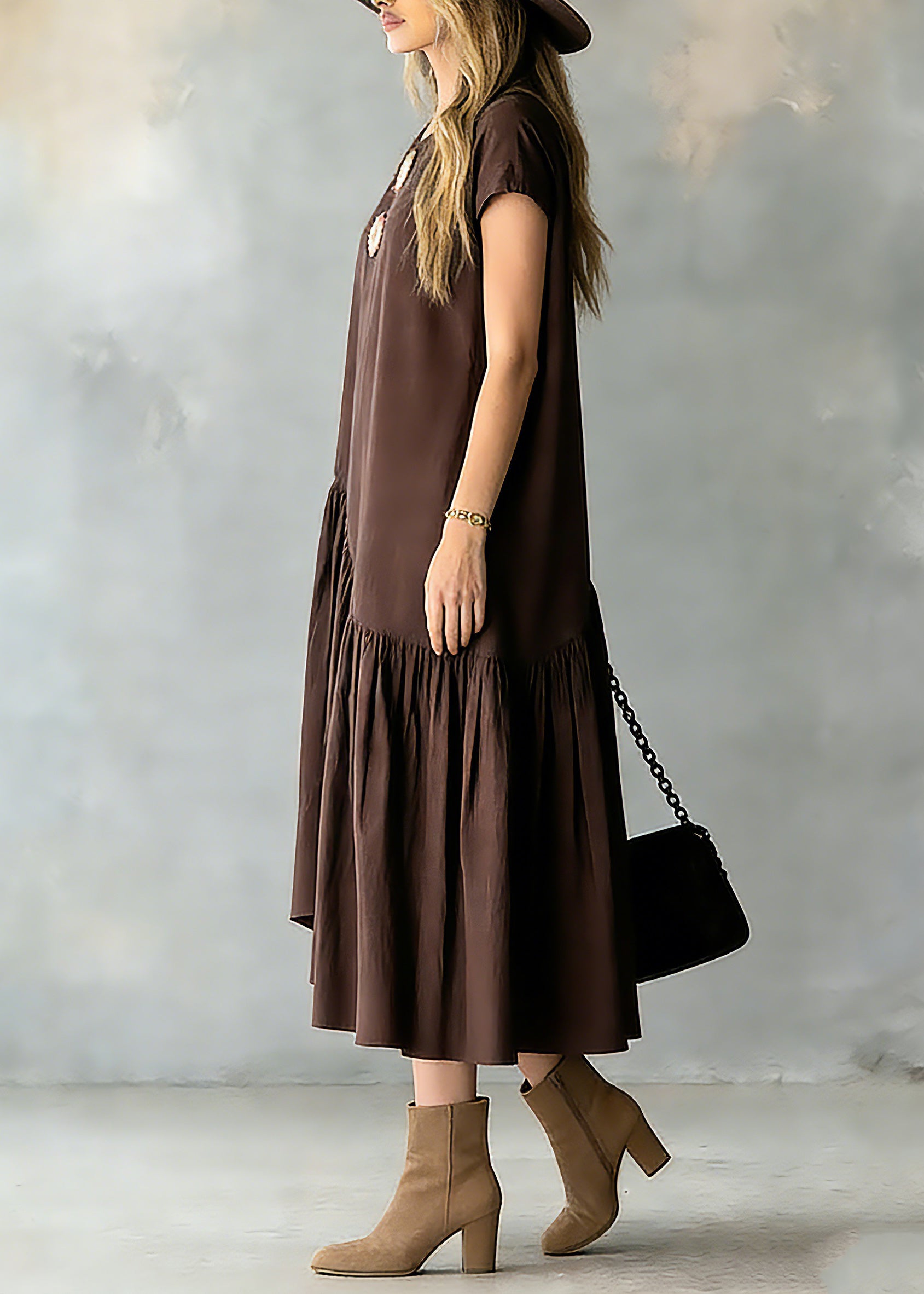 Women Coffee O-Neck Wrinkled Patchwork Long Dresses Short Sleeve